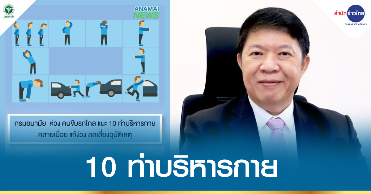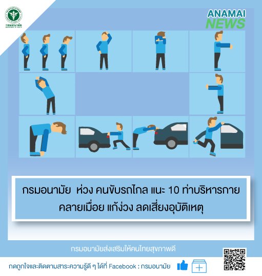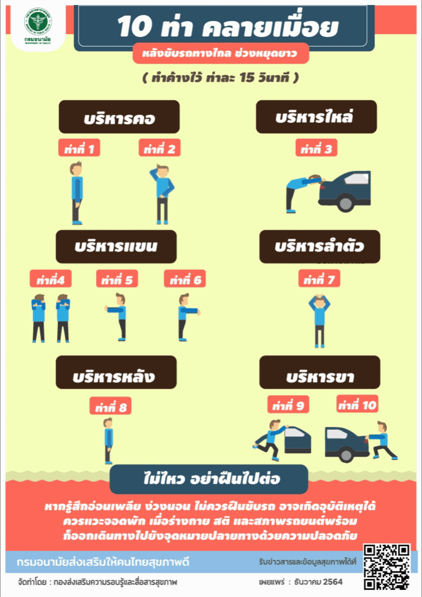 ทางด้าน นพ.อุดม อัศวุตมางกุร ผู้อำนวยการกองกิจกรรมทางกายเพื่อสุขภาพ กล่าวเสริมว่า ผู้ขับรถทางไกล ควรจอดรถพักเป็นระยะๆ เพื่อผ่อนคลายอาการเมื่อยล้า ด้วยการยืดเหยียดกล้ามเนื้อให้กับตนเอง ด้วยวิธีการง่ายๆ โดยเริ่มจากท่าที่ 1 ยืนตรง มือเท้าเอว ยื่นคางไปด้านหน้าจนใต้คางตึง ทำค้างไว้ 15 วินาที กลับสู่ท่าเริ่มต้น ศีรษะตรง แล้วก้มศีรษะจนตึงบริเวณคอด้านหลัง ค้างไว้ 15 วินาที กลับสู่ท่าเดิม (ห้ามกลั้นหายใจขณะบริหารกาย) ท่าที่ 2 ยืนตัวตรง วางมือซ้ายบนศีรษะ แล้วเอียงคอมาด้านขวา จนรู้สึกด้านซ้ายตึง ค้างไว้ 15 วินาที ทำซ้ำใหม่ด้านตรงข้ามเหมือนเดิม ท่าที่ 3 ยืนตรงแยกเท้าเท่าหัวไหล่ มือวางที่ขอบรถ และก้มตัวลงจนรู้สึกตึงที่ไหล่และหลังส่วนบน แขนตึงค้างไว้ 15 วินาที ท่าที่ 4 ยืนตรง ยกแขนขวาพับลงๆ ไว้กลางหลัง มือซ้ายจับศอกขวาดึงมาทางด้านซ้ายจนตึงต้นแขนด้านหลัง ค้างไว้ 15 วินาที ทำซ้ำใหม่ด้านตรงข้ามเหมือนเดิม ท่าที่ 5 ยืนตรง ยกแขนขวาไปด้านหน้าระดับไหล่ ปลายนิ้วตั้งขึ้น ใช้มือซ้ายวางที่ฝ่ามือขวา แล้วดันเข้าหาตัวจนรู้สึกตึงปลายแขนด้านใน ค้างไว้ 15 วินาที ทำซ้ำใหม่ด้านตรงข้ามเหมือนเดิม