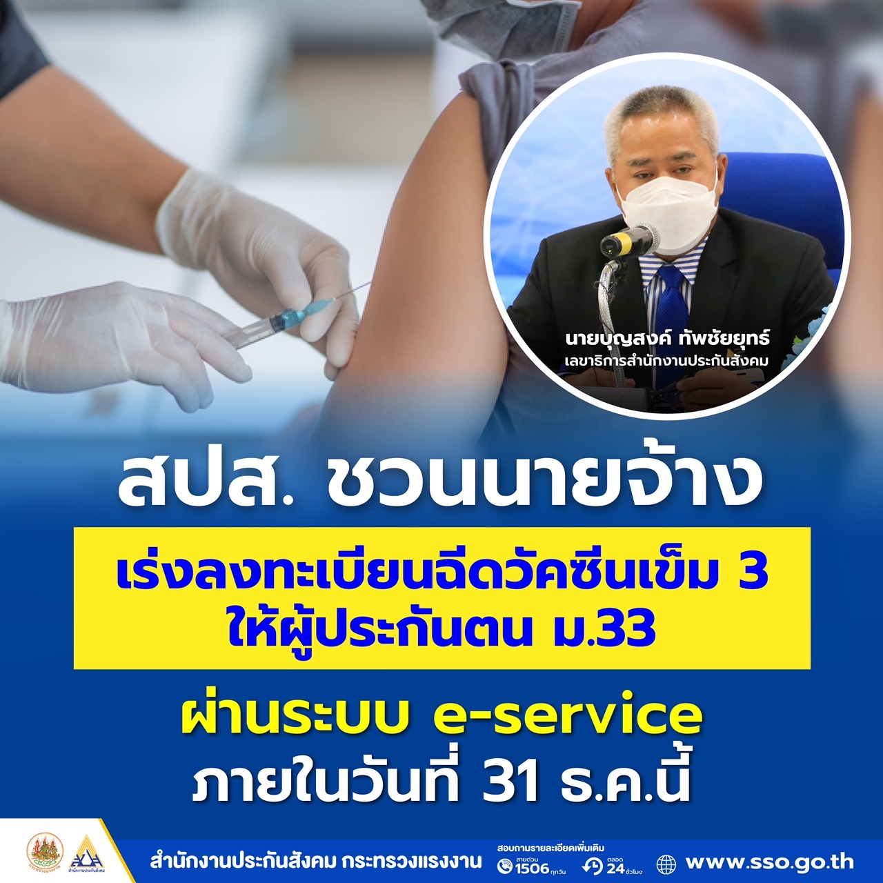 กรุงเทพฯ 24 ธ.ค. – สปส.ชวนนายจ้างเร่งลงทะเบียนฉีดวัคซีนเข็ม 3 ให้ลูกจ้าง ผ่านระบบ e-Service ภายในวันที่ 31 ธ.ค.นี้