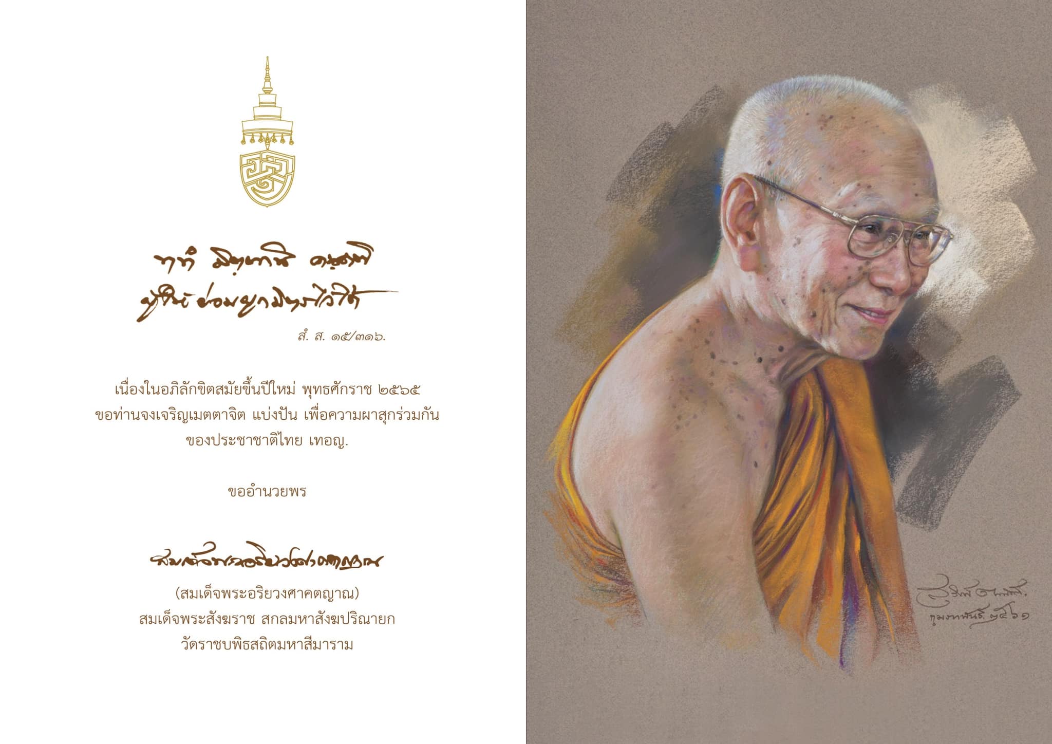 กทม. 25 ธ.ค.-เนื่องในอภิลักขิตสมัยขึ้นปีใหม่ พุทธศักราช ๒๕๖๕ เจ้าพระคุณ สมเด็จพระอริยวงศาคตญาณ สมเด็จพระสังฆราช สกลมหาสังฆปริณายก โปรดประทานพระรูป พร้อมลายพระหัตถ์เชิญพระพุทธภาษิต เป็นพระคติธรรม ประทานพรสำหรับความสุขปีใหม่ พุทธศักราช ๒๕๖๕ ว่า