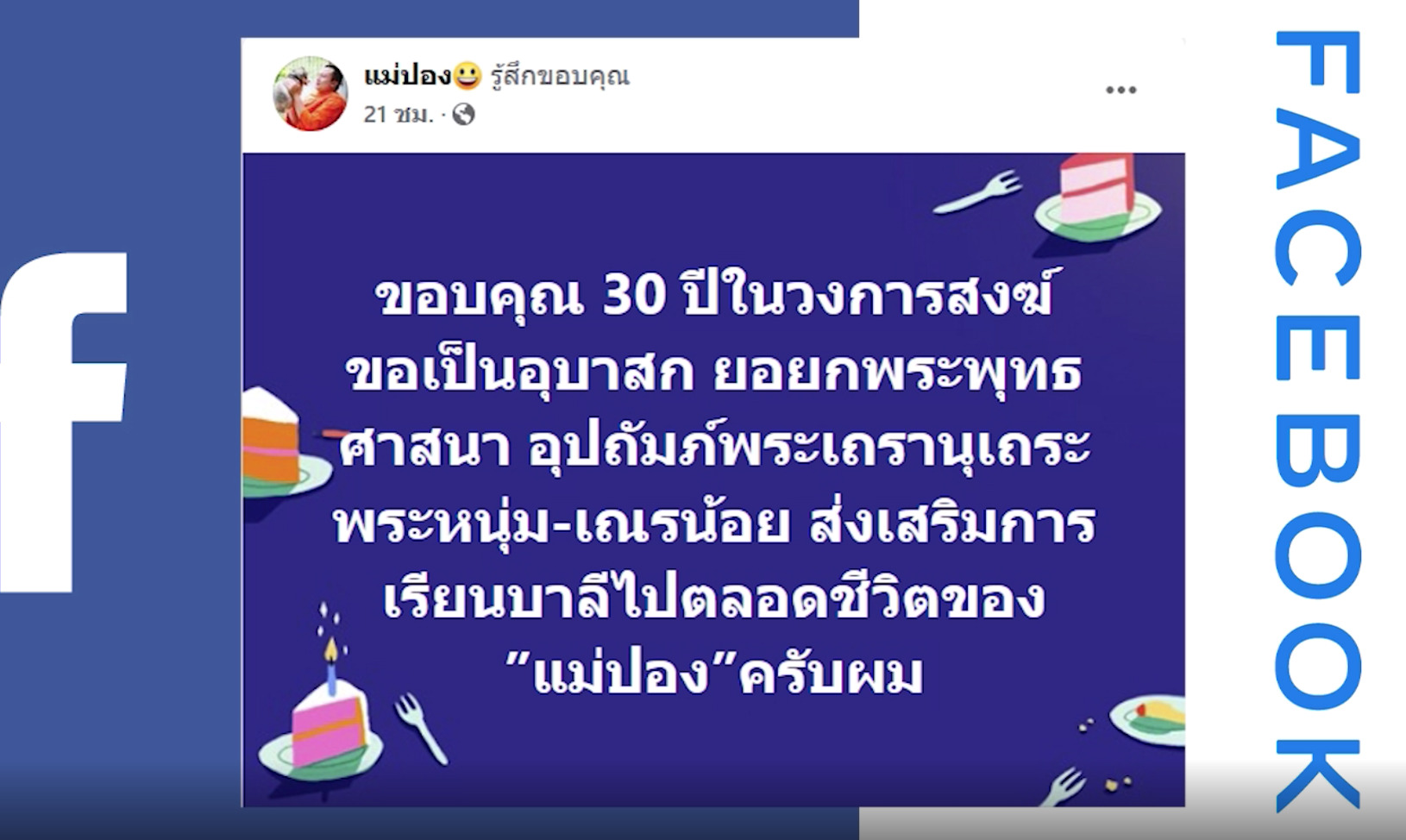 กรุงเทพฯ 29 ธ.ค.- ฤกษ์สึกของพระมหาสมปองหรือตอนนี้เป็นทิดสมปองไปแล้วคือ เวลา13.09 น. อดีตพระมหาสมปองเคลื่อนไหวผ่านเฟซบุ๊ก “แม่ปอง” ขอบคุณ 30 ปีในวงการสงฆ์ ปฏิบัติกิจนิมนต์สุดท้าย มอบถุงยังชีพต้นภัยหนาวที่ อ.ฮอด จ.เชียงราย ก่อนเดินทางมาลาสิกขาที่กรุงเทพฯ บ่ายวันนี้ตามกฤษ์