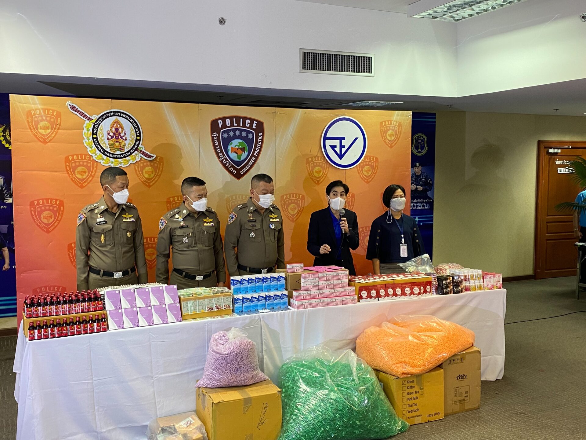 ที่กองบังคับการปราบปรามการกระทำความผิดเกี่ยวกับการคุ้มครองผู้บริโภค (ปคบ.) ศูนย์ราชการแจ้งวัฒนะ พล.ต.ต.อนันต์ นานาสมบัติ ผบก.ปคบ.,พ.ต.อ.ธรากร เลิศพรเจริญ รอง ผบก.ปอท.รรท.รองผบก.ปคบ.,พ.ต.อ.เนติ วงษ์กุหลาบ ผกก.4 บก.ปคบ.พร้อม ภญ.สุภัทรา บุญเสริม ผู้ทรงคุณวุฒิด้านมาตรฐานผลิตภัณฑ์ด้านสาธารณสุข รักษาราชการแทนรองเลขาธิการคณะกรรมการอาหารและยา แถลงผลการปฏิบัติงาน กวาดล้างผู้จำหน่ายผลิตภัณฑ์เสริมอาหารผสมสารไซบูทรามีนและขายยาชุดลดน้ำหนักทางสื่อออนไลน์โดยไม่ได้รับอนุญาต ตรวจค้นเป้าหมาย 15จุด สามารถจับกุมผู้ต้องหาตามหมายจับได้ 14ราย พร้อมยึดของกลางที่เกี่ยวข้องเพื่อรอขยายผลต่อไป