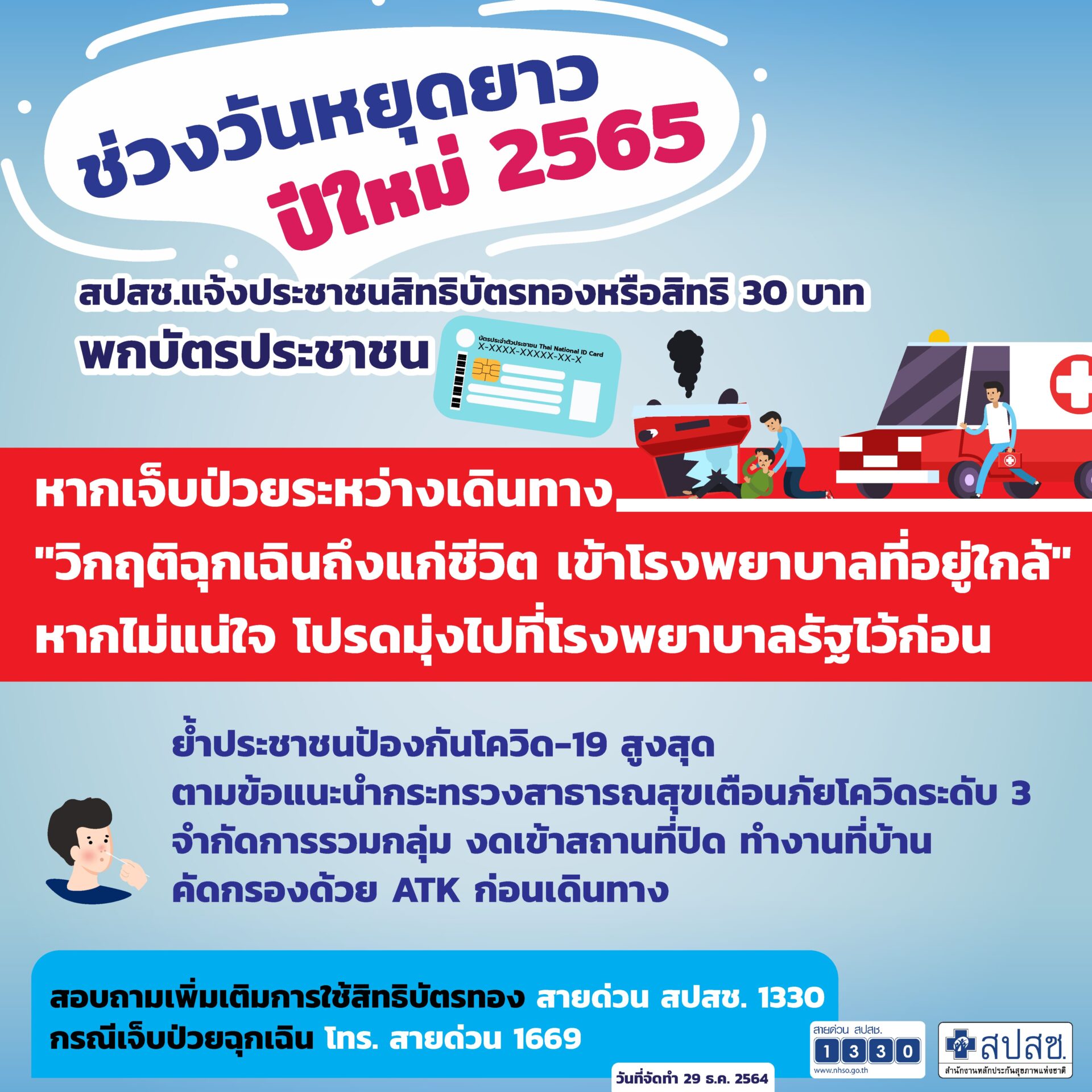 นพ.จเด็จ ธรรมธัชอารี เลขาธิการสำนักงานหลักประกันสุขภาพแห่งชาติ (สปสช.) กล่าวว่า ในช่วงเทศกาลปีใหม่ 2565 นี้ที่มีวันหยุดยาวระหว่างวันที่ 31 ธันวาคม 2564 ถึง 3 มกราคม 2565 ประชาชนส่วนใหญ่จะเดินทางต่างจังหวัดเพื่อกลับบ้านหรือเยี่ยมเยียนครอบครัว นายอนุทิน ชาญวีรกูล รองนายกรัฐมนตรีและรัฐมนตรีว่าการกระทรวงสาธารณสุข ได้สั่งการให้ สปสช.ดูแลพร้อมแจ้งผู้มีสิทธิหลักประกันสุขภาพแห่งชาติ หรือ สิทธิบัตรทอง หากเจ็บป่วยต้องเข้ารักษาที่โรงพยาบาล ในการเข้ารับบริการแบ่งเป็น 2 กรณี ดังนี้