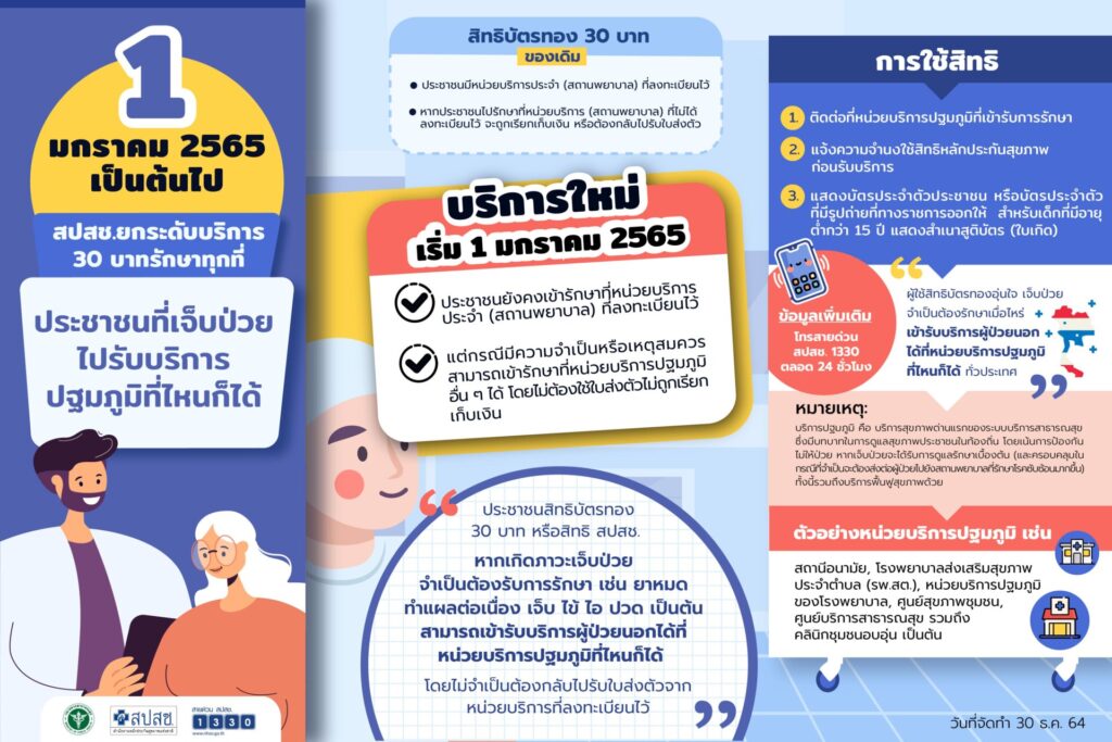 ในส่วนของการยกระดับบัตรทอง 30 บาท ให้เป็น 30 บาทรักษาทุกที่ ซึ่งนำร่องในบางพื้นที่เมื่อปี 2564 ที่ผ่านมา และในปี 2565 นี้ จะมีการขยายให้ครอบคลุมทั่วประเทศ เป็นของขวัญปีใหม่ให้กับประชาชนไทย ตั้งแต่วันที่ 1 ม.ค. 2565 เป็นต้นไป หากประชาชนอยู่ในพื้นที่ที่ไม่ใช่หน่วยบริการประจำที่ลงทะเบียนไว้ แล้วเกิดการเจ็บป่วยที่ไม่ใช่กรณีป่วยฉุกเฉิน สามารถเข้ารับบริการในระบบบริการปฐมภูมิที่ไหนก็ได้ทั่วประเทศ โดยที่หน่วยบริการจะไม่มีการเรียกให้กลับไปรับใบส่งตัวมาเหมือนในอดีต ที่เคยเป็นปัญหากับพี่น้องประชาชน