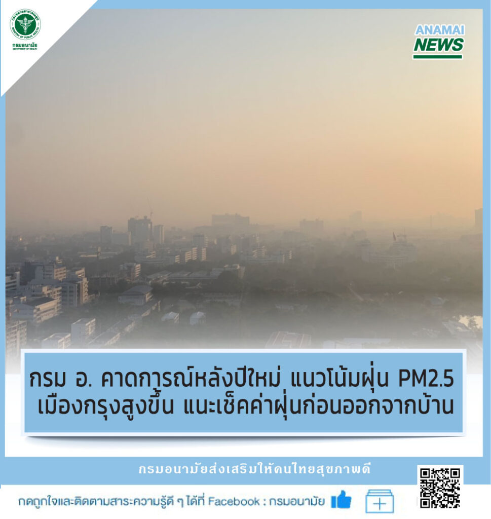 นายแพทย์สุวรรณชัย วัฒนายิ่งเจริญชัย อธิบดีกรมอนามัย เปิดเผยว่า ในช่วงเทศกาลปีใหม่ ตั้งแต่วันที่31 ธันวาคม 2564 ถึง 3 มกราคม 2565 สถานการณ์ฝุ่น PM2.5 ในทุกพื้นที่อยู่ในระดับดีถึงดีมาก เนื่องจากสภาพอากาศ ที่เปิดมากขึ้น ประกอบกับลมตะวันออกเฉียงเหนือที่มีกำลังแรงขึ้น แต่ในช่วงวันที่ 4 – 5 มกราคม 2565 ในพื้นที่กรุงเทพมหานคร และปริมณฑล อาจมีแนวโน้มของระดับฝุ่นละอองที่สูงขึ้น เนื่องจากสภาพอากาศที่นิ่ง และลมอ่อน ร่วมกับการจราจรที่เพิ่มขึ้นหลังเดินทางกลับจากการหยุดยาวในช่วงปีใหม่ ประชาชนจึงควรติดตามสถานการณ์คุณภาพอากาศอย่างใกล้ชิดก่อนออกจากบ้าน ด้วยการดูค่า PM2.5 หรือค่า AQI ได้ที่เว็บไซต์ http://air4thai.pcd.go.th หรือแอปพลิเคชัน “Air4Thai” ของกรมควบคุมมลพิษ โดยต้องแปลผลให้ถูกต้อง หากค่า PM2.5 อยู่ในช่วง 51–90 ไมโครกรัมต่อลูกบาศก์เมตร ซึ่งเท่ากับค่า AQI ที่ 101–200 ถือว่าอยู่ในระดับเกินมาตรฐานและเริ่มมีผลกระทบต่อสุขภาพ (สีส้ม) แต่หากพบค่า PM2.5 ที่สูงกว่า 91 ไมโครกรัมต่อลูกบาศก์เมตร ขึ้นไป ซึ่งเทียบเท่า AQI ที่สูงกว่า 201 ขึ้นไป อยู่ในระดับ มีผลกระทบต่อสุขภาพ (สีแดง) ควรปฏิบัติตนตามคำแนะนำอย่างเคร่งครัด และสามารถประเมินอาการจากการรับสัมผัสฝุ่นละออง และพฤติกรรมการป้องกันฝุ่นละอองได้ที่ https://4health.anamai.moph.go.th/index หรือ LINE Official https://lin.ee/P63zRoP