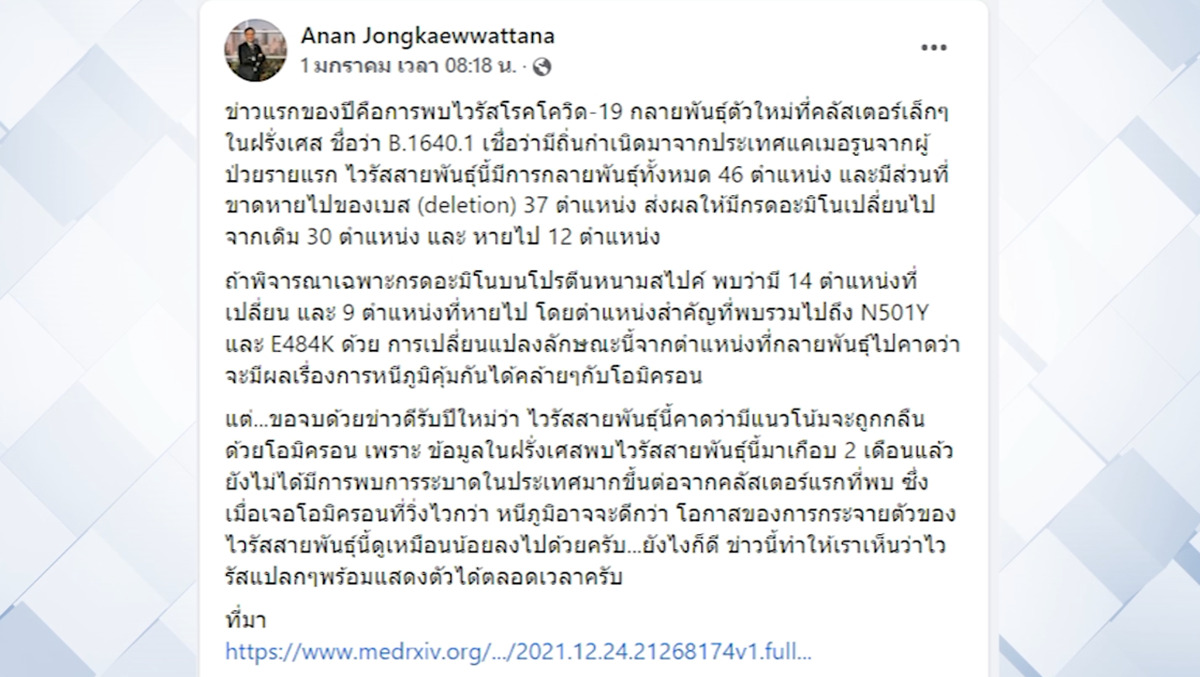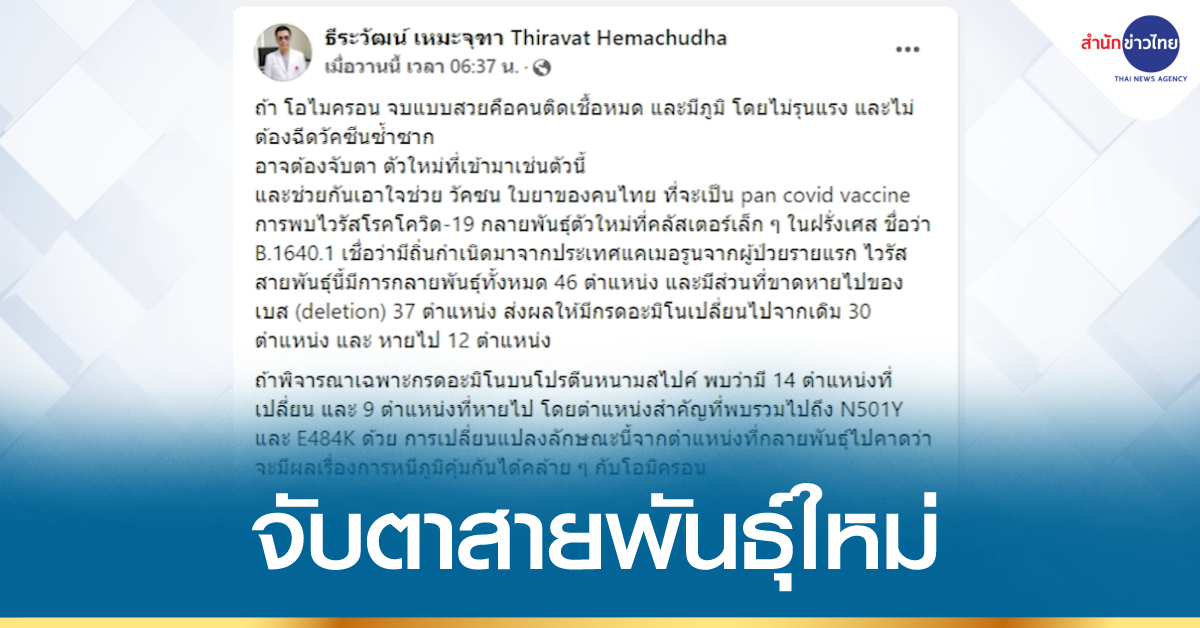 ศ.นพ.ธีระวัฒน์ เหมะจุฑา ผู้อำนวยการศูนย์วิทยาศาสตร์สุขภาพโรคอุบัติใหม่ คณะแพทยศาสตร์ จุฬาลงกรณ์มหาวิทยาลัย เปิดเผยผ่านทางเฟซบุ๊กส่วนตัว ถึงการพบโควิดสายพันธุ์ใหม่ B.1640.1 โดยระบุว่า ถ้าโอไมครอนจบแบบสวยคือคนติดเชื้อหมด และมีภูมิคุ้มกัน โดยไม่รุนแรง และไม่ต้องฉีดวัคซีนซ้ำ อาจต้องจับตาตัวใหม่ที่เข้ามาเช่นตัวนี้ และช่วยกันเอาใจช่วยวัคซีนใบยาของคนไทย ที่จะเป็น pan covid vaccine