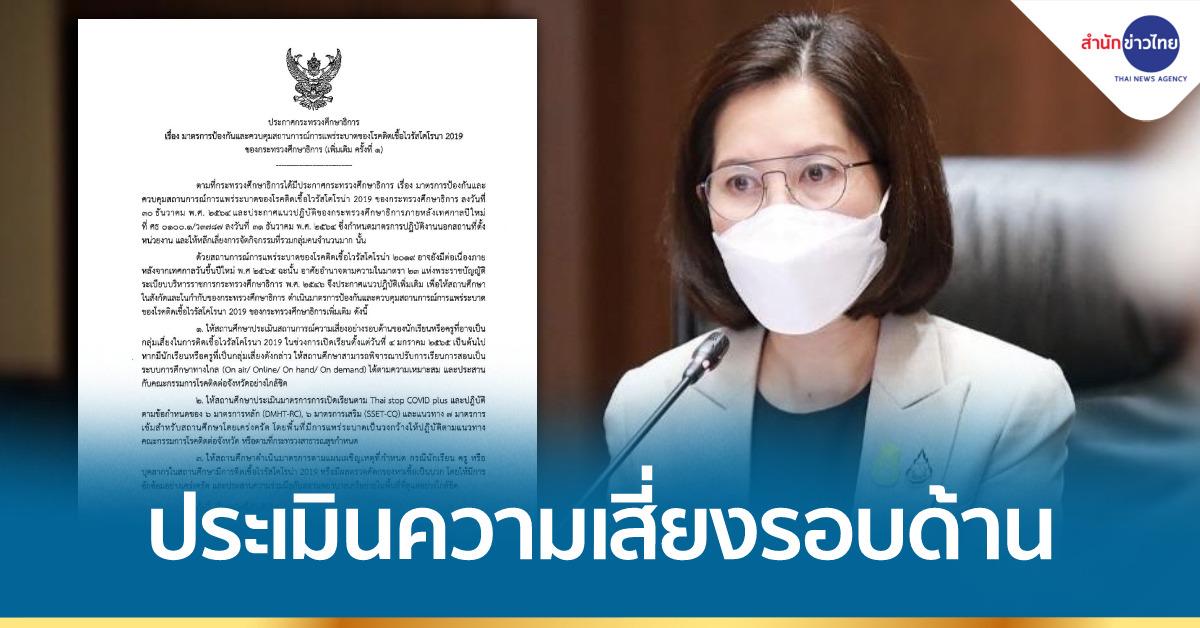 กรุงเทพฯ 3 ม.ค.-ศธ. ออกประกาศเพิ่มเติมสกัดโควิดระบาดในสถานศึกษา ให้สถานศึกษาประเมินสถานการณ์ความเสี่ยงอย่างรอบด้าน หากมีนักเรียนหรือครูเป็นกลุ่มเสี่ยง ให้พิจารณาปรับการเรียนการสอนตามความเหมาะสม