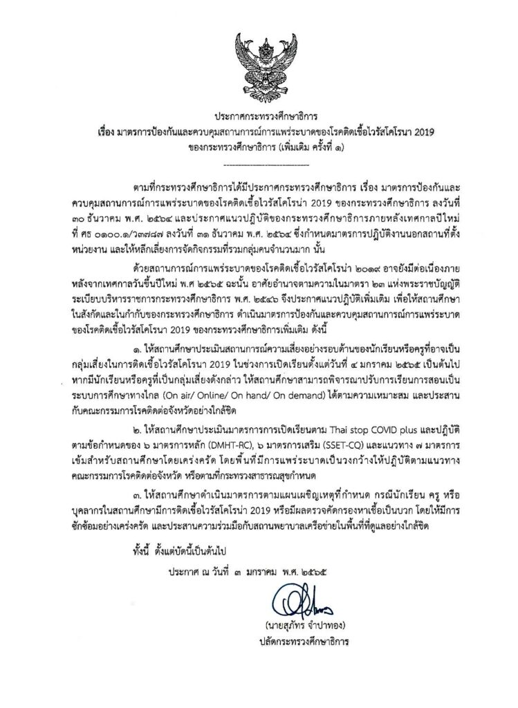 ประกาศแนวปฏิบัติเพิ่มเติมครั้งที่ 1 ฉบับนี้ออกมา เพื่อให้สถานศึกษาในสังกัดและในกำกับของกระทรวงศึกษาธิการ ทุกระดับ ทุกประเภททั่วประเทศ ดำเนินมาตรการป้องกันและควบคุมสถานการณ์การแพร่ระบาดของโรคติดเชื้อไวรัสโคโรนา 2019 ของศธ.เพิ่มเติม ดังนี้ 1.ให้สถานศึกษาประเมินสถานการณ์ความเสี่ยงอย่างรอบด้านของนักเรียนหรือครูที่อาจเป็นกลุ่มเสี่ยงในการติดเชื้อ โควิด-19 ในช่วงการเปิดเรียนตั้งแต่วันที่ 4 มกราคม 2565 เป็นต้นไป หากมีนักเรียนหรือครูที่เป็นกลุ่มเสี่ยงดังกล่าว ให้สถานศึกษาสามารถพิจารณาปรับการเรียนการสอนเป็นระบบการศึกษาทางไกล คือ On air , Online, On hand และ On demand) ได้ตามความเหมาะสม และประสานกับคณะกรรมการโรคติดต่อจังหวัดอย่างใกล้ชิด