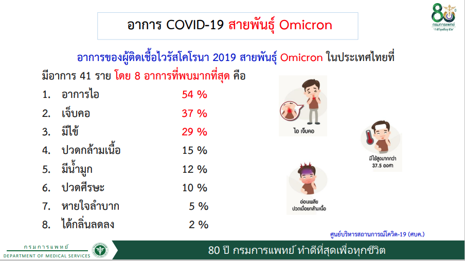 นพ.สมศักดิ์ อรรฆศิลป์ อธิบดีกรมการแพทย์ กล่าวว่า สถานการณ์การติดเชื้อโควิด-19 ขณะนี้ก้าวเข้าสู่เวฟที่ 5 หรือระลอกที่ 5 จากการคาดการณ์ ของดร.สันต์ ศรีอรรฆ์ธำรง อาจารย์พิเศษคณะบริหารการพัฒนาสิ่งแวดล้อม สถาบันบัณฑิตพัฒนบริหารศาสตร์ (นิด้า) โดยมาเร็วกว่าคาดการณ์ไว้ และกราฟการติดเชื้อก็กำลังตั้งชัน จากเดิมที่คาดว่าผู้ติดเชื้อจะสูงสุดในวันที่ 10 ม.ค. จึงเร็วกว่าคาดการณ์ 5 วัน โดยวันนี้ แม้จำนวนผู้ป่วยติดเชื้อจะอยู่ที่ 3,899 คน แต่ตัวเลขคนติดเชื้อจากการตรวจ ATK ประมาณ 3,000 คน ซึ่งจะทำให้มีผู้ป่วยรวมกว่า 7,000 คน สำหรับอาการของโอไมครอน รุนแรงน้อยกว่า เดลตา แต่แพร่เร็วกว่า มีอาการไอ 54% เจ็บคอ 39% ไข้ 29% อาการคล้ายไข้หวัดแยกยาก ดังนั้นใครรู้ตัวมีอาการคล้ายไข้หวัด ควรงดทำกิจกรรมร่วมกับผู้อื่น พร้อมย้ำการตรวจวัดไข้ที่ห้างสรรพสินค้า หรือการตรวจวัดไข้ก่อนเข้าพื้นที่เพื่อไปทำกิจกรรม อาจไม่ใช่ตัวชี้วัดสำคัญที่เกี่ยวกับโควิดอีกต่อไป แต่ต้องเน้นย้ำมาตรการส่วนบุคคลอย่างเคร่งครัด สวมหน้ากาก เว้นระยะห่าง ล้างมือ และหากไม่มั่นใจก็ต้องมีการตรวจ ATK