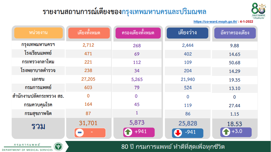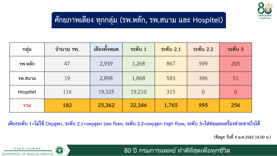 นพ.สมศักดิ์ กล่าวว่า สำหรับอัตราครองเตียง หากไม่เกินการคาดการณ์ของกรมควบคุมโรคที่คาดไว้สูงสุดไม่เกินวันละ 30,000 คน ก็มีเตียงรองรับเพียงพอ โดยมีเตียงสำรวจในระบบรองรับได้ 50,000 เตียง ทั้งประเทศ เพราะโอไมครอน ป่วยหนักรุนแรงนอนรักษาตัวประมาณ 14 วัน ขณะนี้มีเตียงทั้งหมดใน กทม. ปริมณฑล ในระบบ 31,701 เตียง ใช้ไปแล้ว 5,873 เตียง เหลือ 25,828 เตียง คิดเป็นอัตราครองเตียง 18.53 เบื้องต้นหากมีการป่วย เมื่อตรวจ ATK พบว่าเป็นบวก ติดเชื้อให้โทรศัพท์ หมายเลข 1330 เพื่อติดต่อรับการดูแลในระบบ ประสาน สปสช. จับคู่กับคลินิกดูแล หากผู้ป่วยโทรศัพท์ และยังไม่ได้การดูแลช่วยเหลือภายใน 6 ชม. ก็จะถอนคลินิกนั้นออกจากระบบของ สปสช. ทั้งนี้การรักษาผู้ป่วยจะใช้ Hi First (Home Isolation ) และ Ci First (Community Isolation ) เป็นหลัก จะไม่เน้นใช้ฮอสพิเทลอีกต่อไป เนื่องจากมีภาระค่าใช้จ่ายสูงกว่า ส่วนการอยู่ Hi จะเข้ามาสู่ รพ.ต่อเมื่อในรอบ 24 ชม. ไข้สูงเกิน 39 องศาฯ อัตรากาหายใจมากกว่า 25 ครั้งต่อนาที ระดับออกซิเจนในเลือด 94% หรือมีโรคประจำตัว หากมีอาการดังกล่าวโทรศัพท์มาที่ 1669 เพื่อประสาน รพ.มารับตัวไปดูแล.-สำนักข่าวไทย