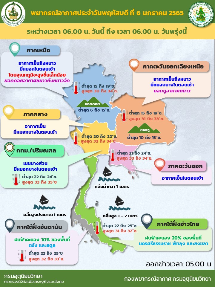 กรมอุตุฯ 6 ม.ค. – กรมอุตุฯ เผยภาคเหนือ-อีสาน อากาศเย็นถึงหนาว ส่วนภาคกลาง-ตะวันออก อากาศเย็นในตอนเช้า ยอดดอยหนาวถึงหนาวจัด ขณะที่กรุงเทพฯ-ปริมณฑล มีหมอกบางตอนเช้า อุณหภูมิต่ำสุด 22-24 องศาฯ