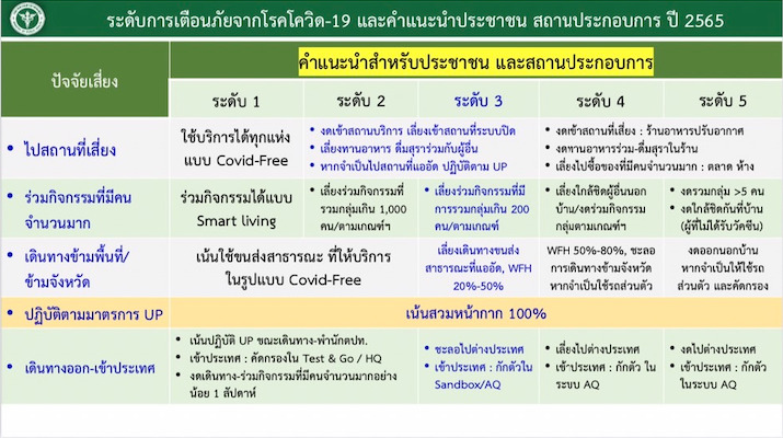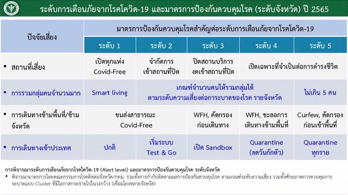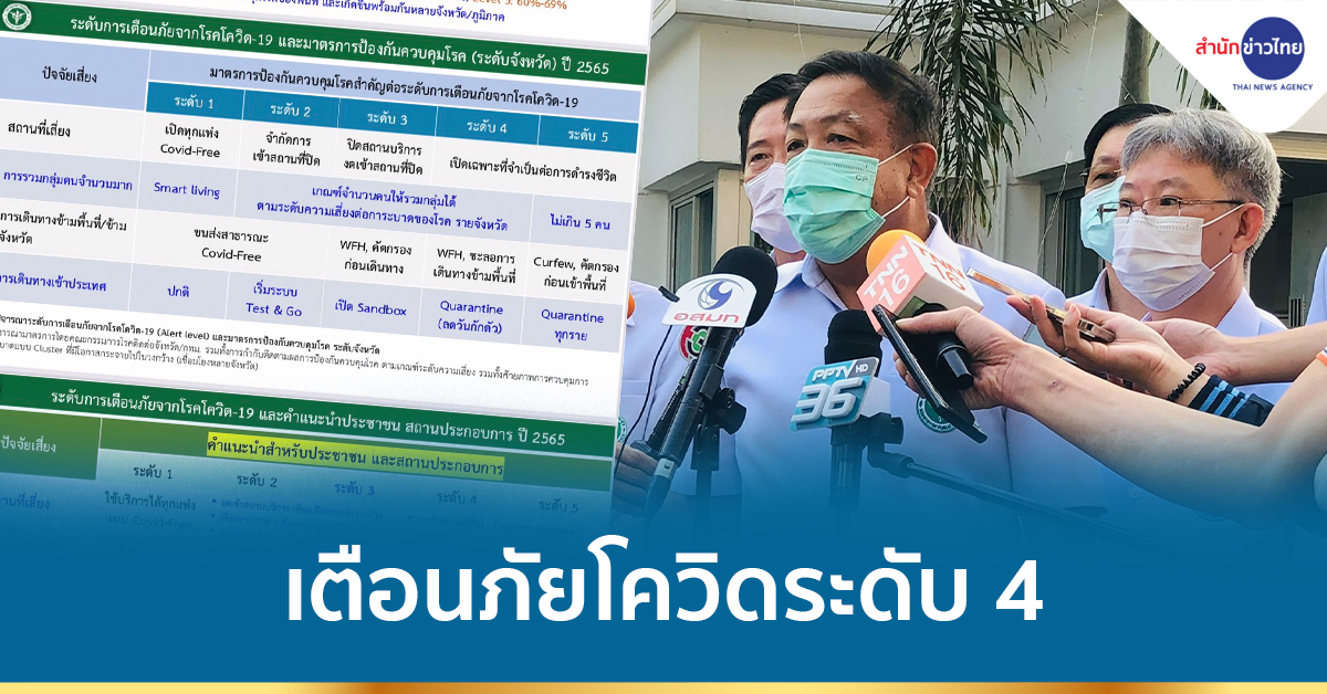 นพ.เกียรติภูมิ วงศ์รจิต ปลัดกระทรวงสาธารณสุข กล่าวถึงสถานการณ์โควิดและมาตรการป้องกันควบคุมโรค ว่า วันนี้พบผู้ป่วยติดเชื้อ 5,775 คน ตาย 11 คน ทั้งนี้พบจำนวนผู้ป่วยติดเชื้อมากขึ้น ส่วนหนึ่งเพราะโอไมครอน แพร่โรคเร็ว แต่แม้ว่าจะไม่รุนแรง และ 95% ติดเชื้อไม่มีอาการ แต่หากพบจำนวนผู้ป่วยเพิ่มมากขึ้นก็มีโอกาสที่จะมีผู้เสียชีวิตมากขึ้น ทั้งนี้เพื่อเป็นการควบคุมและชะลอการระบาดของโรค จึงเตรียมยกระดับมาตรการแจ้งเตือนภัยโควิด จากเดิมระดับ 3 เป็นระดับ 4 มีผลให้ปิดสถานที่เสี่ยงและจำกัดการเดินทางข้ามจังหวัด อาจมีเพิ่มมาตรการต่างๆ เนื่องจากที่ผ่านมา มีการทำกิจกรรม ทั้งงานเลี้ยงสังสรรค์ในสถานที่ปิด อากาศไม่ถ่ายเท กิจกรรมศาสนาและการเดินทางกลับภูมิลำเนาของประชาชน ทำให้มีการแพร่กระจายเชื้อรวดเร็ว จึงขอความร่วมมือประชาชน สังเกตตัวเอง 14 วัน หรือตรวจATK ทุก 3 วันหรือทุกสัปดาห์ และหากผลเป็นบวก ให้โทรผ่านหมายเลข 1330 เพื่อรับการดูแลตามระบบ แต่หากผู้ป่วยมีอาการน้อยดูแลที่บ้าน Home Isolation (Hi) มีการจัดยาเวชภัณฑ์ อาหาร เครื่องวัดไข้ วัดออกซิเจน เพื่อใช้ในการดูแลรักษาตัวที่บ้าน และหากมีอาการรุนแรงขึ้นก็จะมีระบบส่งต่อแบบรวดเร็ว หรือโทรผ่านหมาย 1669 เพื่อรับผู้ป่วยมาดูอาการที่โรงพยาบาล