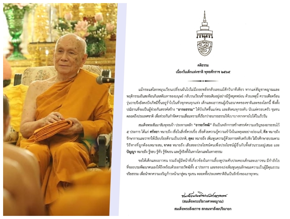เนื่องในวันเด็กแห่งชาติ พุทธศักราช 2565 สมเด็จพระอริยวงศาคตญาณ สมเด็จพระสังฆราช สกลมหาสังฆปริณายก ประทานพระคติธรรม ความว่า