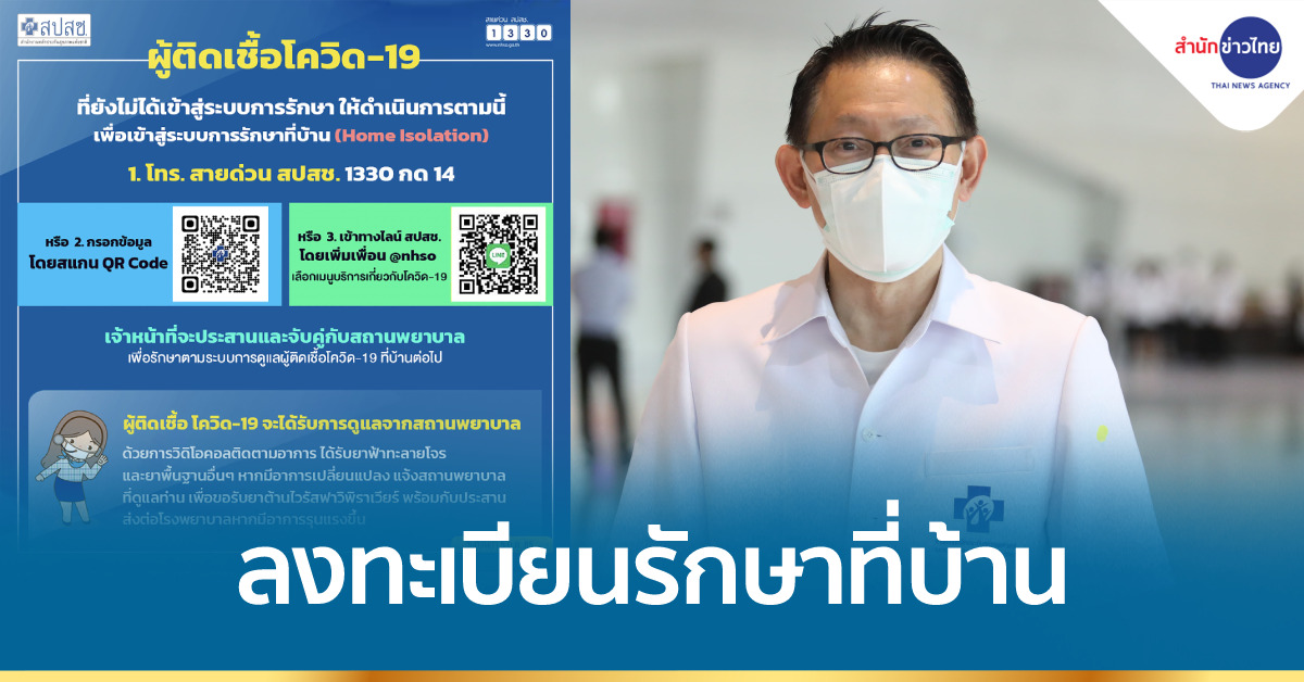 กรุงเทพฯ 6 ม.ค.-สปสช.เปิด 3 ช่องทางลงทะเบียนสู่ระบบการรักษาที่บ้าน (Home Isolation) ประชาชนทุกคนที่ตรวจ ATK หากพบผลเป็นบวก โทร. สายด่วน สปสช. 1330 กด 14 หรือลงทะเบียนด้วยตนเองทางเว็บไซต์ เพื่อเข้าสู่ระบบการรักษาที่บ้าน โดยจะได้รับการจับคู่สถานพยาบาล เพื่อติดตามและได้รับการดูแลตามมาตรฐาน ป้องกันอาการภาวะรุนแรง พร้อมควบคุมเผ้าระวังโรค