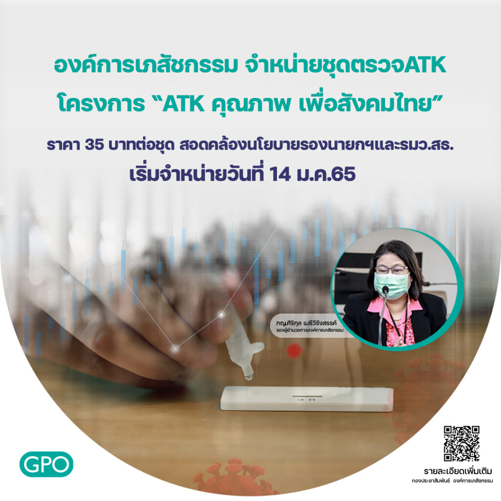 ภญ.ศิริกุล เมธีวีรังสรรค์ รองผู้อำนวยการองค์การเภสัชกรรม กล่าวว่า ชุดตรวจโควิด-19 (ATK) ในโครงการ “ATK คุณภาพ เพื่อสังคมไทย” ซึ่งเป็นชุดตรวจโควิด-19 (แบบตรวจแอนติเจนด้วยตนเอง) ที่ได้รับการขึ้นทะเบียนจากสำนักงานคณะกรรมการอาหารและยา (อย.) โดยองค์การเภสัชกรรม ได้นำมาจำหน่ายราคาชุดละ 40 บาท ซึ่งได้รับกระแสตอบรับจากประชาชน องค์กร บริษัทและหน่วยงานอื่นเป็นจำนวนมาก ทั้งนี้จากการจัดซื้อรอบใหม่ ทำให้ได้ราคาลดลงจากก่อนหน้านี้ องค์การเภสัชกรรมจึงนำมาจำหน่ายให้ประชาชนในราคา 35 บาทต่อชุด จำนวน 3 ล้านชุด โดยเริ่มจำหน่ายวันศุกร์ที่ 14 มกราคม 2565 ผ่านร้านขายยาขององค์การเภสัชกรรมทั้ง 8 สาขา สำหรับการจำหน่ายทางออนไลน์ขององค์การเภสัชกรรม เริ่มจำหน่ายวันจันทร์ที่ 17 มกราคม 2565 เป็นต้นไป ทางเว็บไซต์ www.gpoplanet.com ขณะเดียวกันองค์การเภสัชกรรม ยังได้เร่งดำเนินการจัดซื้อจัดจ้างเพิ่มอีกจำนวน 3.5 ล้านชุด โดยวันที่ 11 มกราคม 2565 มีการเซ็นสัญญากับบริษัทผู้จัดจำหน่ายไปแล้วและบริษัทจะเริ่มทยอยส่งมอบในสัปดาห์หน้า สัปดาห์ละ 1 ล้านชุด และดำเนินการอย่างต่อเนื่องเพื่อให้เพียงพอต่อความต้องการในสถานการณ์ขณะนี้ ทั้งนี้ขอขอบคุณบริษัทผู้ประกอบการทุกรายที่เข้าร่วมโครงการ “ATK คุณภาพ เพื่อสังคมไทย” ทำให้ประชาชนสามารถเข้าถึงชุดตรวจ ATK ได้ในราคาที่เหมาะสม