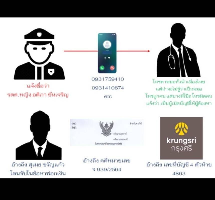 นพ.ชลภิวัฒน์ ตรีพงษ์ นายแพทย์ชำนาญการ สถาบันประสาทวิทยา ผู้ช่วยผู้อำนวยการด้านส่งเสริมภาพลักษณ์องค์กรและประชาสัมพันธ์ เปิดเผยว่า ขณะนี้พบว่ามีแพทย์จำนวนมาก ทั้งสถาบันประสาท ฯ รพ.รามาฯ โรงเรียนแพทย์ และรพ.สังกัดอื่นๆ จำนวนมาก ถูกกลุ่มมิจฉาชีพโทรเข้ามาหลอกลวง ซึ่งเบอร์จะเหมือนๆ กันหมด ขึ้นต้นด้วย 093 และเป็นเบอร์ซ้ำ ๆ กัน โดยตนได้รับสายเเข้ามาเป็นครั้งที่ 2 ครั้งแรกเมื่อวันที่ 10 ม.ค.ที่ผ่านมาแต่เนื่องจากติดคนไข้ เลยไม่ได้คุย ล่าสุดโทรมาอีกครั้งเมื่อประมาณ 10.00 น.ของวันนี้ (12 ม.ค.) จึงได้ทำการอัดเสียงไว้ ทั้งนี้ผู้โทรเข้ามาอ้างว่าชื่อ ร.ต.ต.หญิงอติภา ยันเจริญ แสดงตัวว่าอยู่กรมสอบสวนคดีพิเศษ (ดีเอสไอ) และสน.พญาไท ระบุว่ามีเอกสารฉุกเฉิน คดีแดงเลขที่ จ 939/2564 อ้างว่ามีผู้ต้องหาคดีฟอกเงินชื่อนายสุเมธ ขวัญแก้ว ซัดทอดว่า มีชื่อตนไปเปิดบัญชีธนาคารกรุงศรีให้ จึงขอให้ไปรายงานตัวที่กรมสอบสวนคดีพิเศษ หรือสน.พญาไท