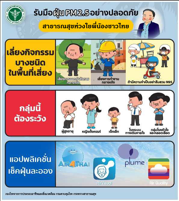 ทั้งนี้ ขอให้ประชาชนตรวจเช็กค่าฝุ่น PM 2.5 จากเว็บไซต์ของกรมควบคุมมลพิษ http://air4thai.pcd.go.th/ หรือผ่านทางแอปพลิเคชัน Air4Thai ก่อนออกจากบ้านทุกครั้ง โดยเฉพาะกลุ่มเสี่ยงที่อาจได้รับผลกระทบโดยตรง ทั้งเด็ก ผู้สูงอายุ หญิงตั้งครรภ์ ผู้ที่มีโอกาสในการรับหรือสัมผัสฝุ่น เช่น ตำรวจจราจร คนขับรถสาธารณะ คนกวาดถนน เป็นต้น และผู้ป่วย 4 กลุ่มโรคสำคัญที่ต้องระวังเป็นพิเศษ คือ กลุ่มโรคหัวใจและหลอดเลือด กลุ่มโรคระบบทางเดินหายใจ กลุ่มโรคผิวหนังอักเสบ กลุ่มโรคตาอักเสบ หากได้รับฝุ่นเข้าสู่ร่างกายอาจทำให้เกิดการเจ็บป่วย หรือมีผลต่อสุขภาพรุนแรงกว่าคนทั่วไป ควรสวมใส่หน้ากากป้องกันฝุ่น (N95) หรือหน้ากากที่มีแผ่นกรองคาร์บอน เนื่องจากมีประสิทธิภาพที่สามารถกรองอนุภาคขนาดเล็กได้ ทุกครั้งที่ออกจากบ้าน หรือเมื่อไปในพื้นที่ที่มีระดับฝุ่น PM 2.5 เกินค่ามาตรฐาน หากมีอาการเบื้องต้น เช่น ไอ หายใจลำบาก แน่นหน้าอก ใจสั่น ระคายเคืองตา หรือหากมีอาการผิดปกติ ให้รีบไปพบแพทย์ทันที