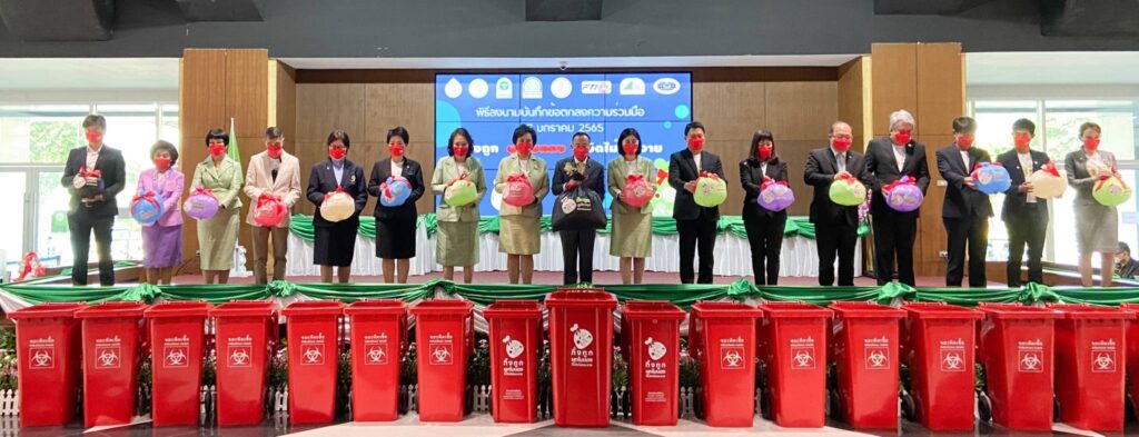 วันนี้ (17 ม.ค 65) เวลา 10.00 น. นายวิรัตน์ มนัสสนิทวงศ์ ผู้อำนวยการสำนักสิ่งแวดล้อม กรุงเทพมหานคร ร่วมลงนามในบันทึกข้อตกลงความร่วมมือโครงการความร่วมมือการจัดการขยะติดเชื้อ “ทิ้งถูก ผูกโบแดง โควิดไม่กระจาย” เพื่อแสดงเจตนารมณ์และความมุ่งมั่นร่วมกันในการกำจัดขยะติดเชื้อไวรัสโคโรนา 2019 หรือโควิด-19 และสร้างความตระหนักรู้ รวมถึงรณรงค์ให้ประชาชนร่วมกันคัดแยกขยะติดเชื้อออกจากขยะทั่วไป เพื่อช่วยลดการแพร่กระจายของเชื้อโควิด-19 โดยมีพลเรือเอก พิเชฐ ตานะเศรษฐ หัวหน้าคณะทำงานกำกับและติดตามการปฏิบัติราชการในภูมิภาค เขต 16 ของรองนายกรัฐมนตรี (พลเอกประวิตร วงษ์สุวรรณ) เป็นประธานในพิธีลงนาม พร้อมด้วย 8 องค์กรภาคี ประกอบด้วย สมาคมสตรีนักธุรกิจและวิชาชีพแห่งประเทศไทย-กรุงเทพฯ ในพระบรมราชินูปถัมภ์, กรมอนามัย, กรมควบคุมมลพิษ, คณะสัตวแพทยศาสตร์ จุฬาลงกรณ์มหาวิทยาลัย, สภาอุตสาหกรรมแห่งประเทศไทย, สมาคมอสังหาริมทรัพย์ไทย และสมาคมธุรกิจบ้านจัดสรร และ 6 องค์กรสนับสนุน ได้แก่ บมจ.บีจีที คอร์ปอเรชั่น, บจก.ซิลเวอร์ ซี เอ็กโซติก เลเธอร์, บจก.วินเนอร์ เอสเตท, สโมสรซอนต้ากรุงเทพ 10, สโมสรโรตารีกรุงเทพไชน่าทาวน์ และมูลนิธิเอิร์ธ อะเจนด้า ร่วมลงนาม ณ บริเวณโถงกลาง อาคารไอราวัตพัฒนา ศาลาว่าการกรุงเทพมหานคร ดินแดง