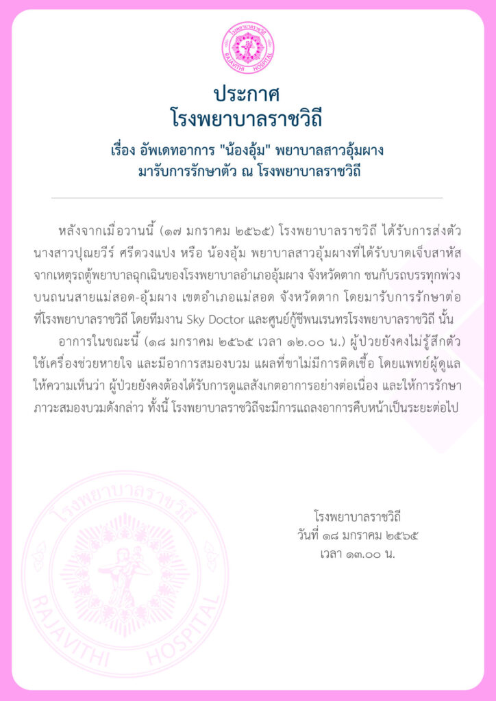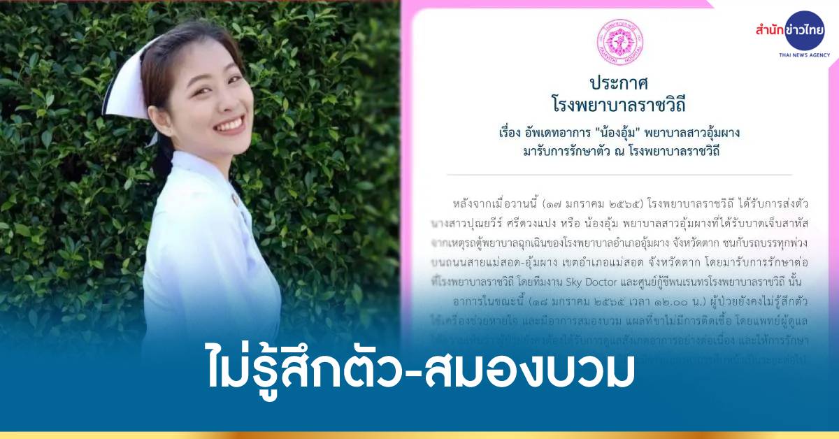 รพ.ราชวิถี 18 ม.ค.-รพ.ราชวิถี อัปเดตอาการ “น้องอุ้ม” พยาบาลสาวอุ้มผาง บาดเจ็บสาหัสจากเหตุรถฉุกเฉินชนกับรถบรรทุกพ่วงในพื้นที่ อ.แม่สอด จ.ตาก หลังรับมารักษาตัวที่โรงพยาบาล ล่าสุดยังไม่รู้สึกตัว ใช้เครื่องช่วยหายใจ และมีอาการสมองบวม
