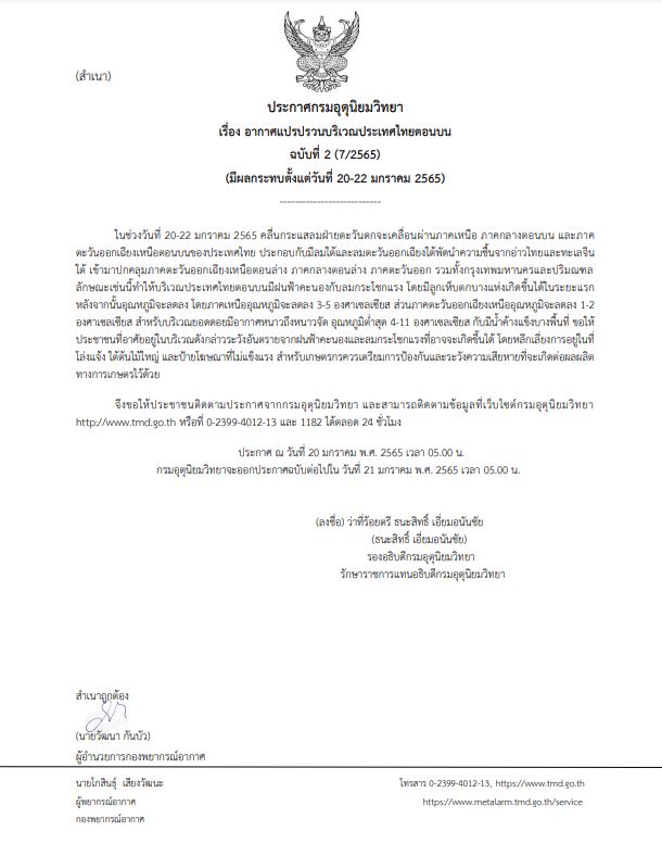 กรมอุตุนิยมวิทยา ออกประกาศ “อากาศแปรปรวนบริเวณประเทศไทยตอนบน (มีผลกระทบตั้งแต่วันที่ 20-22 มกราคม 2565)” ฉบับที่ 2 ลงวันที่ 20 มกราคม 2565 ระบุว่า ในช่วงวันที่ 20-22 มกราคม 2565 คลื่นกระแสลมฝ่ายตะวันตกจะเคลื่อนผ่านภาคเหนือ ภาคกลางตอนบน และภาคตะวันออกเฉียงเหนือตอนบนของประเทศไทย ประกอบกับมีลมใต้และลมตะวันออกเฉียงใต้พัดนำความชื้นจากอ่าวไทยและทะเลจีนใต้ เข้ามาปกคลุมภาคตะวันออกเฉียงเหนือตอนล่าง ภาคกลางตอนล่าง ภาคตะวันออก รวมทั้งกรุงเทพมหานคร และปริมณฑล ลักษณะเช่นนี้ทำให้บริเวณประเทศไทยตอนบนมีฝนฟ้าคะนองกับลมกระโชกแรง โดยมีลูกเห็บตกบางแห่งเกิดขึ้นได้ในระยะแรก หลังจากนั้นอุณหภูมิจะลดลง โดยภาคเหนือ อุณหภูมิจะลดลง 3-5 องศาเซลเซียส ส่วนภาคตะวันออกเฉียงเหนือ อุณหภูมิจะลดลง 1-2 องศาเซลเซียส สำหรับบริเวณยอดดอยมีอากาศหนาวถึงหนาวจัด อุณหภูมิต่ำสุด 4-11 องศาเซลเซียส กับมีน้ำค้างแข็งบางพื้นที่ ขอให้ประชาชนที่อาศัยอยู่ในบริเวณดังกล่าวระวังอันตรายจากฝนฟ้าคะนองและลมกระโชกแรงที่อาจจะเกิดขึ้นได้ โดยหลีกเลี่ยงการอยู่ในที่โล่งแจ้ง ใต้ต้นไม้ใหญ่ และป้ายโฆษณาที่ไม่แข็งแรง สำหรับเกษตรกรควรเตรียมการป้องกันและระวังความเสียหายที่จะเกิดต่อผลผลิตทางการเกษตรไว้ด้วย