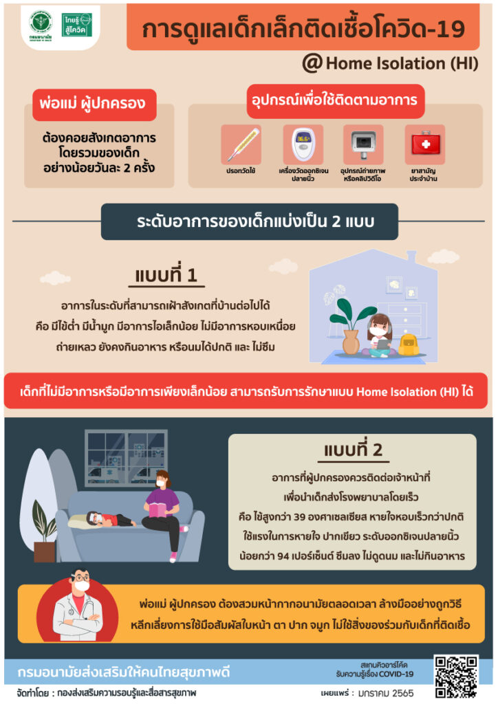 นายแพทย์สุวรรณชัย วัฒนายิ่งเจริญชัย อธิบดีกรมอนามัย กล่าวว่า สถานการณ์การแพร่ระบาดของโควิด-19 ยังคงมีผู้ติดเชื้ออย่างต่อเนื่อง โดยเฉพาะกลุ่มเด็กเล็กติดเชื้อโควิด-19 จากคนในครอบครัว ซึ่งอาการติดเชื้อที่พบตั้งแต่ไม่มีอาการ จนถึงมีอาการรุนแรง เช่น ปอดอักเสบ โดยกลุ่มเสี่ยงที่พบอาการรุนแรงคือ เด็กทารกและเด็กเล็กอายุน้อยกว่า 5 ปี ซึ่งต้องเข้ารับการตรวจหาเชื้อทันที เมื่อตรวจ ATK หรือเมื่อตรวจ RT-PCR ให้ผลพบเชื้อ ส่วนเด็กที่ไม่มีอาการหรือมีอาการเพียงเล็กน้อย สามารถรับการรักษาแบบ Home Isolation (HI) ได้ แต่ต้องมีพ่อแม่ หรือผู้ปกครองที่สามารถดูและประเมินอาการให้เด็กได้ตลอดเวลา โดยใช้อุปกรณ์เพื่อติดตามอาการ ได้แก่ ปรอทวัดไข้ เครื่องวัดออกซิเจนปลายนิ้ว อุปกรณ์ที่สามารถถ่ายภาพหรือคลิปวีดีโออาการของเด็กได้ โทรศัพท์ เพื่อติดต่อกับสถานพยาบาลหากมีเหตุจำเป็น และยาสามัญประจำบ้านเพื่อบรรเทาอาการ ได้แก่ ยาลดไข้ เช่น พาราเซตามอล ยาแก้ไอ ยาลดน้ำมูก และเกลือแร่
