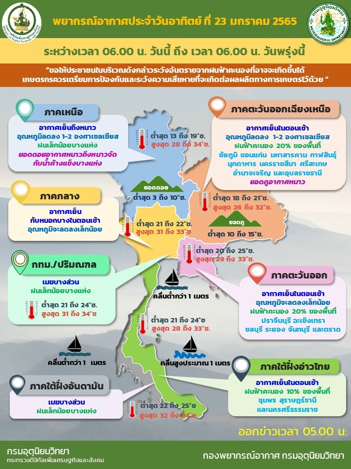 สำหรับบริเวณความกดอากาศสูงหรือมวลอากาศเย็นกำลังอ่อนปกคลุมภาคเหนือตอนบน ภาคตะวันออกเฉียงเหนือของประเทศไทย และทะเลจีนใต้ประกอบกับมีลมฝ่ายตะวันตกในระดับบนพัดปกคลุมประเทศไทยตอนบน ทำให้ภาคเหนือยังคงมีอากาศเย็นถึงหนาวในตอนเช้า ส่วนภาคตะวันออกเฉียงเหนือ ภาคกลาง และภาคตะวันออกมีอากาศเย็นในตอนเช้า บริเวณยอดดอยอากาศหนาวถึงหนาวจัด กับมีน้ำค้างแข็งบางแห่ง อุณหภูมิต่ำสุด 3-10 องศาเซลเซียส และบริเวณยอดภูมีอากาศหนาว อุณหภูมิต่ำสุด 10-15 องศาเซลเซียส ส่วนมรสุมตะวันออกเฉียงเหนือที่พัดปกคลุมอ่าวไทยและภาคใต้มีกำลังอ่อน ทำให้ภาคใต้มีฝนฟ้าคะนองบางแห่ง
