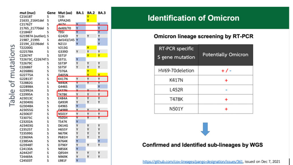 นายแพทย์ศุภกิจ ศิริลักษณ์ อธิบดีกรมวิทยาศาสตร์การแพทย์ กล่าวถึงประเด็นการเฝ้าระวังการกลายพันธุ์ของเชื้อโควิด 19 ว่า กรมวิทยาศาสตร์การแพทย์ ติดตามสถานการณ์การระบาดของสายพันธุ์ในประเทศ และ ติดตามสายพันธุ์น่ากังวลที่อาจพบจากผู้เดินทางเข้าประเทศอย่างต่อเนื่อง ด้วยเทคโนโลยีการตรวจการกลายพันธุ์ (SNP genotyping assay, Targeted sequencing, Whole genome sequencing) ตั้งแต่เดือนเมษายน 2564 เป็นต้นมา ซึ่งพบสายพันธุ์ที่น่ากังวลในประเทศไทย (Variant of Concerns; VOC) ได้แก่ อัลฟา, เบตา, เดลตา จนกระทั่งพบสายพันธุ์โอไมครอน รายแรกเมื่อวันที่ 6 ธันวาคม 2564 โดยเป็นโอไมครอนสายพันธุ์ย่อย BA.1 พบการกลายพันธุ์ตำแหน่ง K417N, T478K, N501Y และ del69/70 แต่ไม่พบการกลายพันธุ์ตำแหน่ง L452R ซึ่งเป็นรูปแบบการกลายพันธุ์รูปแบบหนึ่งของสายพันธุ์โอไมครอน โดยในช่วงแรกประเทศไทยยังคงพบเชื้อโควิด 19 สายพันธุ์โอไมครอน เฉพาะในกลุ่มผู้ติดเชื้อที่เดินทางมาจากต่างประเทศ และประมาณสามสัปดาห์ต่อมาเริ่มพบผู้ติดเชื้อในประเทศ โดยเชื้อโควิด 19 สายพันธุ์โอไมครอน ที่พบในคลัสเตอร์ดังกล่าวเป็นสายพันธุ์ย่อย BA.1
