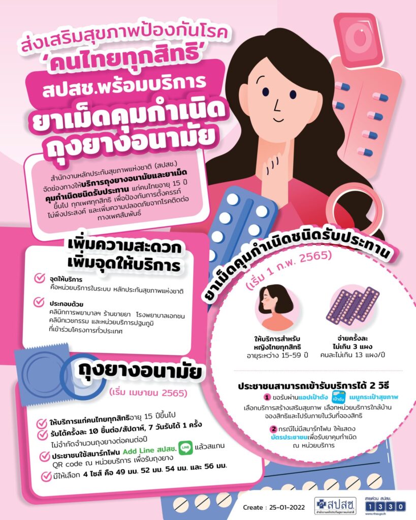 นพ.จักรกริช โง้วศิริ รองเลขาธิการสำนักงานหลักประกันสุขภาพแห่งชาติ (สปสช.) กล่าวถึงแนวทางการให้บริการยาเม็ดคุมกำเนิดชนิดรับประทานและถุงยางอนามัย ปีงบประมาณ 2565 ว่า บริการดังกล่าวเป็นสิทธิประโยชน์ด้านการส่งเสริมสุขภาพและป้องกันโรค ซึ่งในปีนี้ สปสช. ได้เพิ่มจุดให้บริการ เพื่ออำนวยความสะดวกให้ประชาชนเข้าถึงบริการมากขึ้น ซึ่งจะทำให้การป้องกันการตั้งครรภ์ไม่พึงประสงค์ โดยเฉพาะในกลุ่มวัยรุ่น มีประสิทธิภาพมากยิ่งขึ้น และเพิ่มความปลอดภัยจากโรคติดต่อทางเพศสัมพันธ์ด้วย (Safe sex) สำหรับจุดให้บริการ คือ หน่วยบริการในระบบหลักประกันสุขภาพแห่งชาติ ประกอบด้วย คลินิกการพยาบาลฯ ร้านขายยา โรงพยาบาลเอกชน คลินิกเวชกรรม และหน่วยบริการปฐมภูมิ