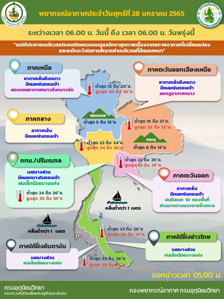 กรมอุตุนิยมวิทยา พยากรณ์อากาศ 24 ชั่วโมงข้างหน้า บริเวณความกดอากาศสูงหรือมวลอากาศเย็นที่ปกคลุมภาคเหนือและภาคตะวันออกเฉียงเหนือตอนบนของประเทศไทยและทะเลจีนใต้มีกำลังอ่อน ประกอบกับมีลมฝ่ายตะวันตกในระดับบนพัดพาความหนาวเย็นจากประเทศเมียนมาเข้ามาปกคลุมบริเวณภาคเหนือ ลักษณะเช่นนี้ทำให้ประเทศไทยตอนบนยังคงมีอากาศเย็นถึงหนาวกับมีหมอกในตอนเช้า โดยภาคเหนือและภาคตะวันออกเฉียงเหนือ มีอากาศเย็นถึงหนาว ส่วนภาคกลาง และภาคตะวันออก มีอากาศเย็นในตอนเช้า สำหรับยอดดอยมีอากาศหนาวถึงหนาวจัด อุณหภูมิต่ำสุด 5-12 องศาเซลเซียส และยอดภูมีอากาศหนาว อุณหภูมิต่ำสุด 8-14 องศาเซลเซียส ในขณะที่ลมใต้และลมตะวันออกเฉียงใต้พัดปกคลุมภาคกลางตอนล่าง รวมทั้งกรุงเทพมหานครและปริมณฑล และภาคตะวันออก ทำให้บริเวณดังกล่าวมีฝนเกิดขึ้น ในระยะนี้ ขอให้ประชาชนบริเวณประเทศไทยตอนบนดูแลรักษาสุขภาพเนื่องจากสภาพอากาศที่เปลี่ยนแปลง และระมัดระวังในการสัญจรผ่านบริเวณที่มีหมอกหนาไว้ด้วย สำหรับมรสุมตะวันออกเฉียงเหนือที่พัดปกคลุมอ่าวไทยและภาคใต้มีกำลังอ่อน ทำให้ภาคใต้มีฝนน้อย โดยมีฝนเล็กน้อยบางแห่ง
