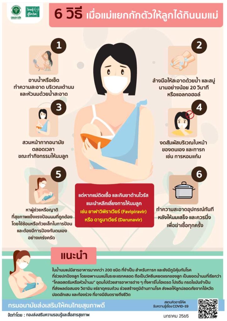 นพ.สุวรรณชัย วัฒนายิ่งเจริญชัย อธิบดีกรมอนามัย กล่าวว่า การแพร่ระบาดของโควิด-19 ยังคงมีผู้ติดเชื้ออย่างต่อเนื่อง ส่วนใหญ่มีอาการไม่รุนแรง อาจไม่จำเป็นต้องได้รักษาแบบผู้ป่วยในของโรงพยาบาล แต่ให้แยกกักตัวที่บ้าน Home Isolation (HI) เพื่อสังเกตอาการได้ โดยเฉพาะแม่ที่ติดเชื้อแต่มีอาการไม่รุนแรง หรืออยู่ในกลุ่มเฝ้าระวังการติดเชื้อ ยังสามารถให้นมลูกได้ปกติ ไม่ว่าจะเป็นการให้นมจากเต้า หรือการเก็บสำรองนมแม่ไว้ สำหรับแม่ที่มีอาการติดเชื้อและจำเป็นต้องแยกแม่ลูก ควรเก็บสำรองน้ำนมโดยให้คนอื่นเป็นผู้ป้อนแทน หากแม่ที่ติดเชื้อและมีอาการรุนแรง ต้องแยกแม่และลูก และงดให้นมแม่ แนะนำให้บีบระบายน้ำนมทิ้ง เพื่อให้แม่คงสภาพการมีน้ำนมและสามารถกลับมาให้นมแม่ได้เมื่อมีอาการดีขึ้นหรือหายปกติ โดยมีหลักต้องปฏิบัติตามการแนะนำ 6 วิธี ดังนี้