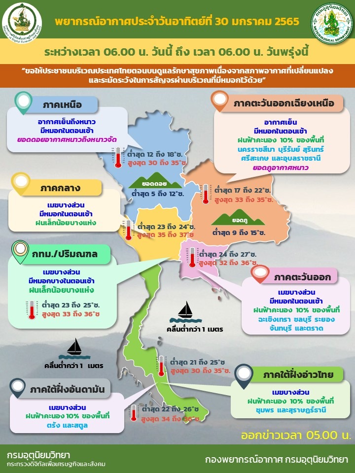 กรมอุตุนิยมวิทยา เผยลมฝ่ายตะวันตกในระดับบนยังคงพัดปกคลุมภาคเหนือและภาคตะวันออกเฉียงเหนือ ทำให้บริเวณดังกล่าวยังคงมีอากาศเย็นถึงหนาวในภาคเหนือและภาคตะวันออกเฉียงเหนือ ในขณะที่บริเวณความกดอากาศสูงหรือมวลอากาศเย็นระลอกใหม่ได้แผ่ลงมาปกคลุมถึงประเทศจีนตอนใต้ เวียดนามตอนบน และทะเลจีนใต้แล้ว คาดว่าจะแผ่ลงมาปกคลุมภาคตะวันออกเฉียงเหนือตอนบนของประเทศไทยในวันพรุ่งนี้ (31 ม.ค. 65) ส่งผลให้มีลมใต้และลมตะวันออกเฉียงใต้พัดนำความชื้นจากทะเลเข้ามาปกคลุมภาคตะวันออกและภาคตะวันออกเฉียงเหนือ ทำให้บริเวณดังกล่าวมีฝนฟ้าคะนองบางแห่ง สำหรับยอดดอยมีอากาศหนาวถึงหนาวจัด อุณหภูมิต่ำสุด 5-12 องศาเซลเซียส ส่วนยอดภูมีอากาศหนาว อุณหภูมิต่ำสุด 9-15 องศาเซลเซียส ขอให้ประชาชนบริเวณดังกล่าวดูแลรักษาสุขภาพเนื่องจากสภาพอากาศที่เปลี่ยนแปลง และระมัดระวังการสัญจรผ่านบริเวณที่มีหมอกไว้ด้วย สำหรับมรสุมตะวันออกเฉียงเหนือที่พัดปกคลุมอ่าวไทยและภาคใต้มีกำลังอ่อน ทำให้ภาคใต้มีฝนเล็กน้อยบางแห่ง
