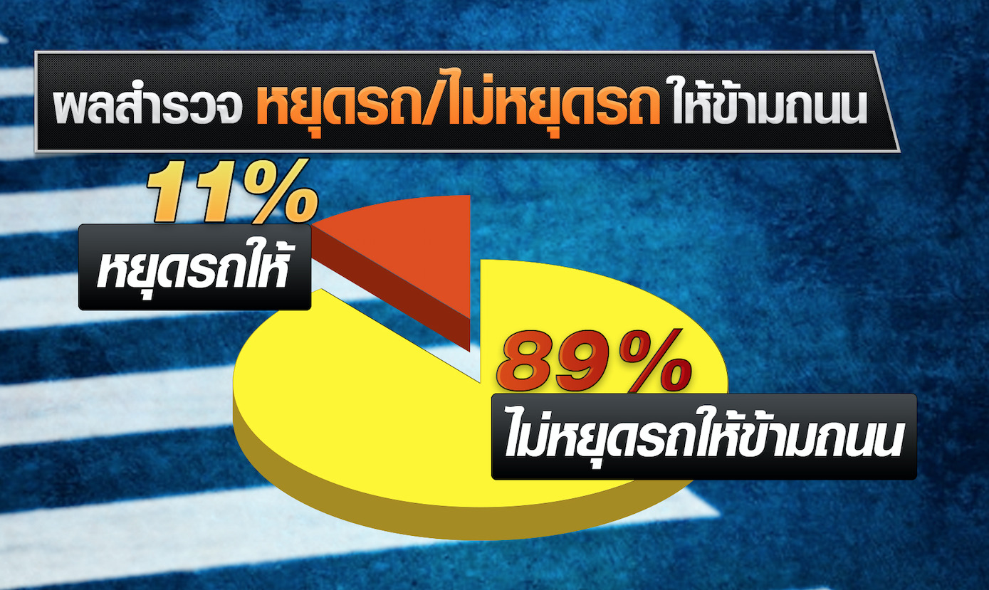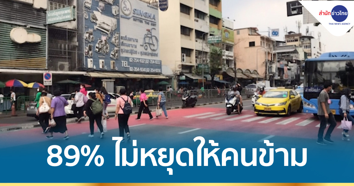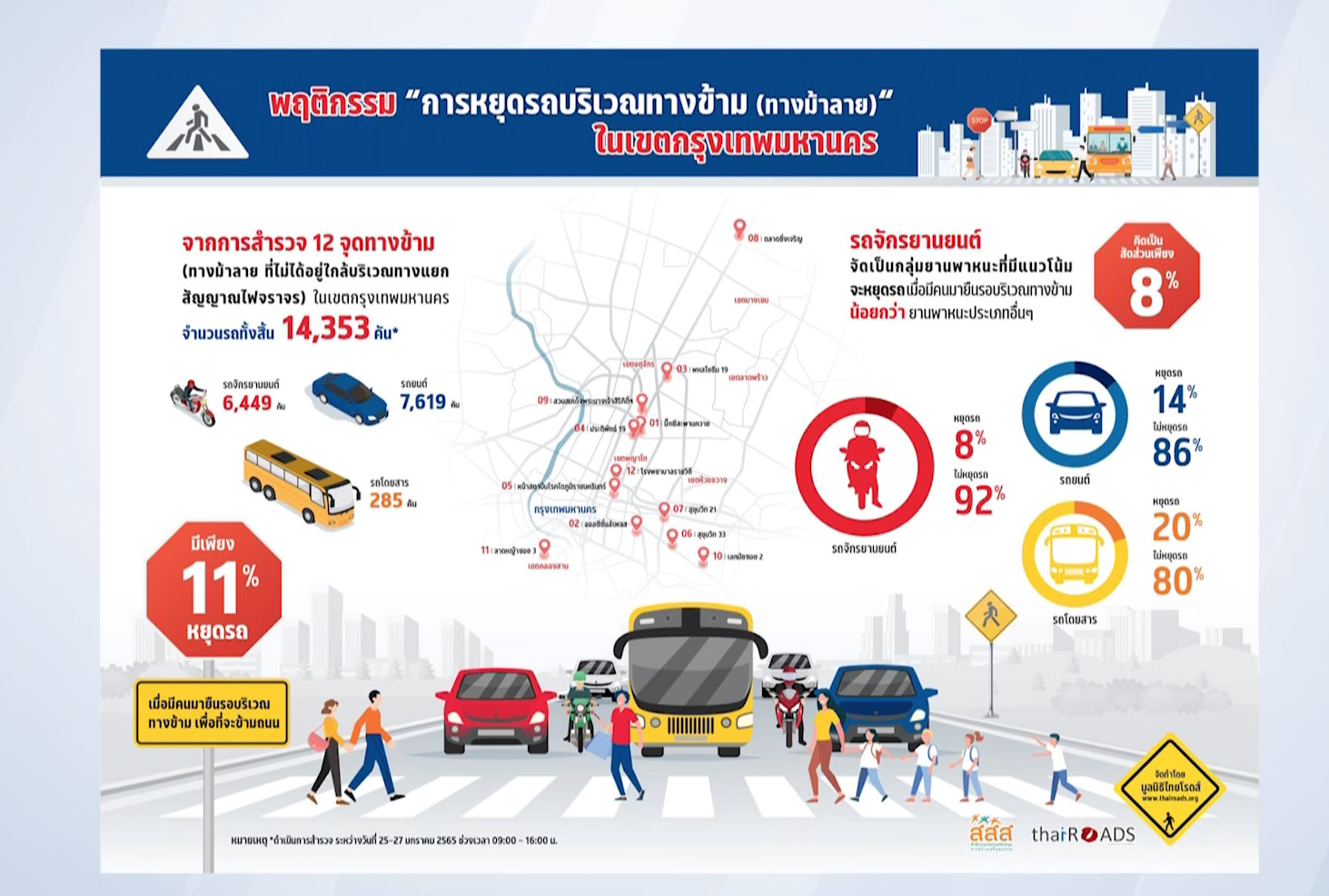 จากการสำรวจพฤติกรรมการหยุดรถบริเวณทางข้ามม้าลาย 12 จุดระหว่างวันที่ 25-27 มกราคม 2565 แบ่งเป็น รถจักรยานยนต์ 6,449 คัน รถยนต์ 7,619 คัน และรถโดยสาร 285 คัน รวม 14,353 คัน พบว่า 89% ไม่หยุดรถเมื่อมีคนมายืนรอเพื่อข้ามถนน มีเพียง 11% ที่หยุดรถ โดยรถจักรยานยนต์ไม่หยุดให้คนข้ามมากที่สุดถึง 92% คิดเป็นสัดส่วน 8% เท่านั้นที่หยุดรถให้คนข้าม รองลงมาคือ รถยนต์ไม่หยุดรถ 86% และรถโดยสารไม่หยุดรถ 80%