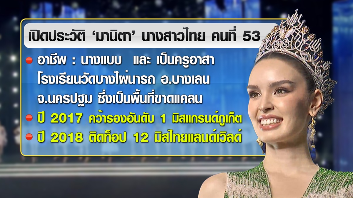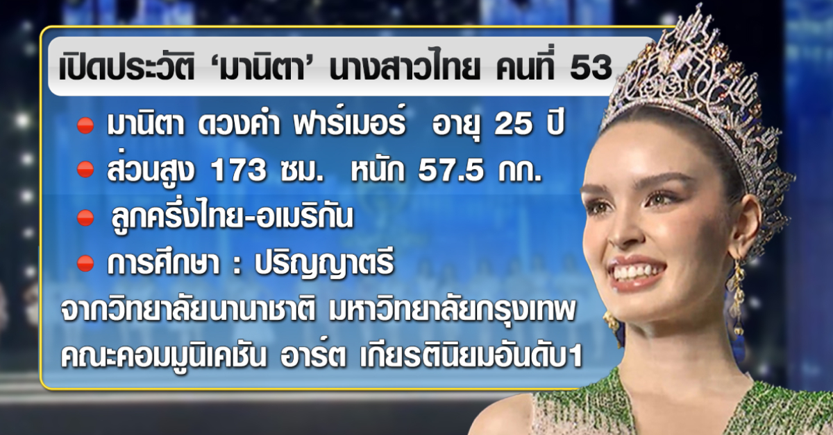 กรุงเทพฯ 7 ก.พ. – เปิดประวัติ “นิต้า” มานิตา ดวงคำ ฟาร์เมอร์ สาวงามลูกครึ่งไทย-อเมริกัน วัย 25 ปี ที่คว้ามงกุฎ “นางสาวไทย” คนที่ 53