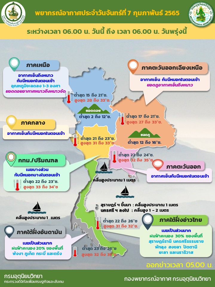 กรมอุตุฯ 7 ก.พ. – กรมอุตุฯ เผยภาคเหนือตอนบนอากาศหนาวเย็นลง อุณหภูมิลด 1-3 องศาฯ ขณะที่ภาคอีสาน ภาคกลาง และภาคตะวันออก อุณหภูมิสูงขึ้น กับมีหมอกตอนเช้า ส่วนภาคใต้ฝนฟ้าคะนอง