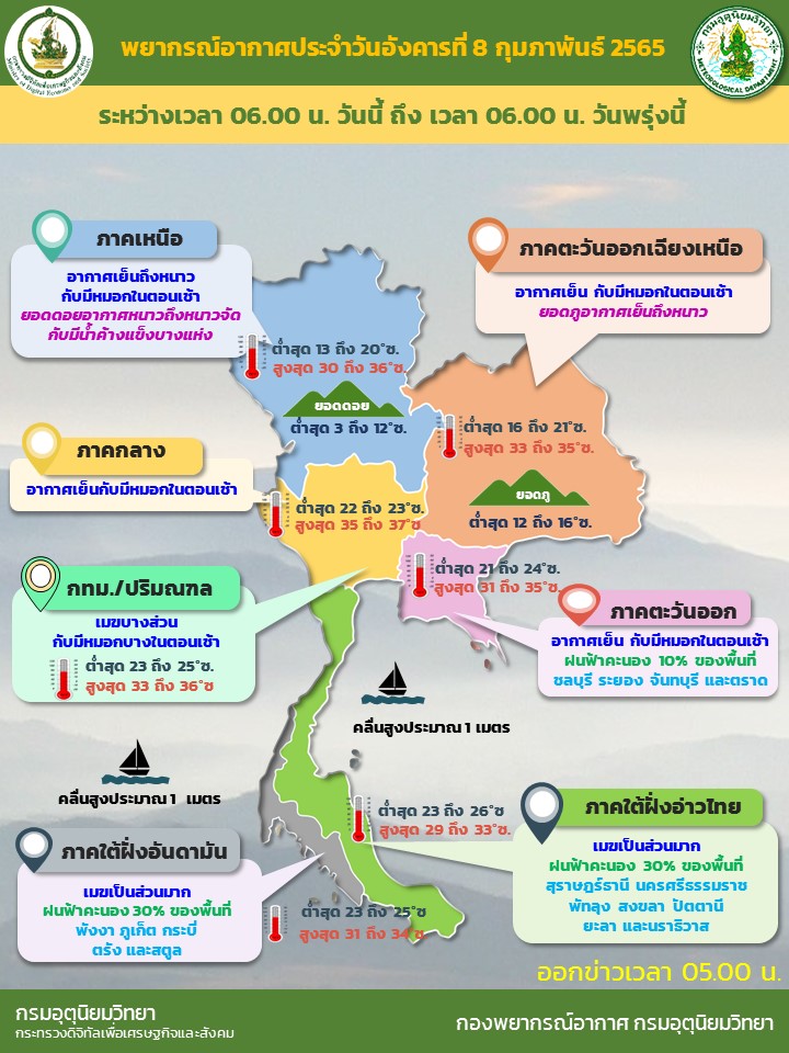 กรมอุตุฯ 8 ก.พ. – กรมอุตุฯ เผยภาคเหนืออากาศเย็นถึงหนาว ขณะที่ภาคอีสาน ภาคกลาง และภาคตะวันออก อุณหภูมิสูงขึ้น แต่ยังคงมีอากาศเย็น กับมีหมอกตอนเช้า ส่วนภาคใต้ฝนฟ้าคะนองบางพื้นที่