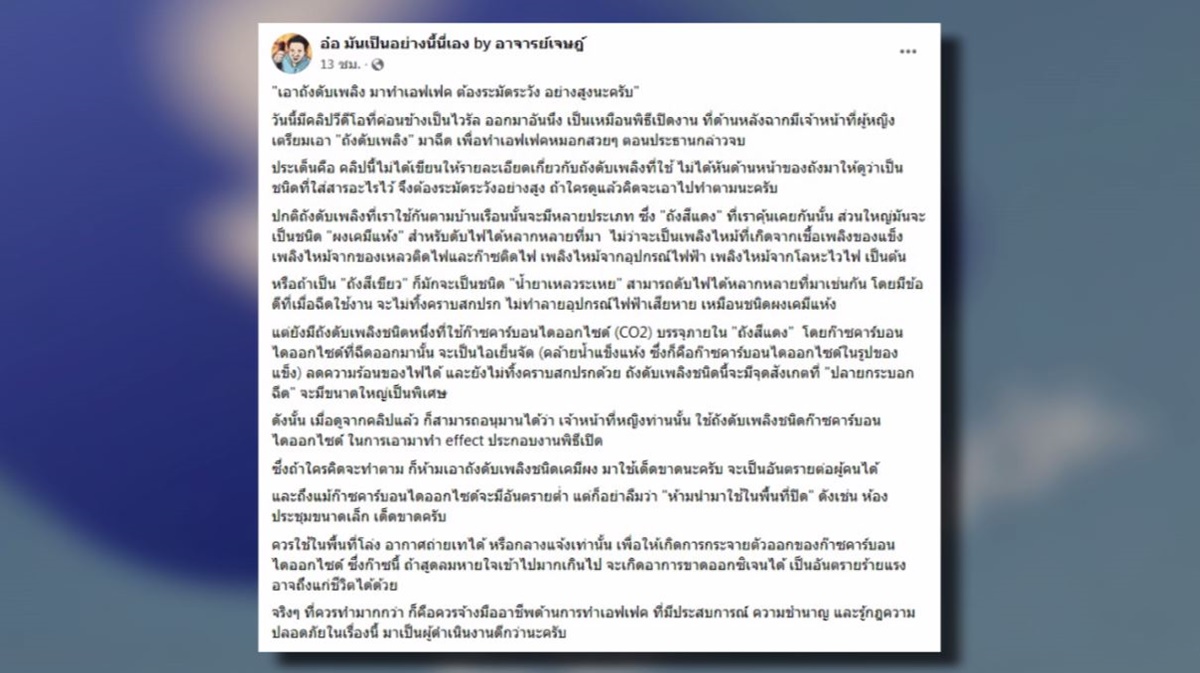 กรุงเทพฯ 9 ก.พ. – “รศ.ดร.เจษฎา” เตือนอย่าใช้ถังดับเพลิงทำเอฟเฟกต์ “ดรายไอซ์” ชี้ก๊าซคาร์บอนไดออกไซด์อาจทำให้เกิดภาวะขาดออกซิเจนได้