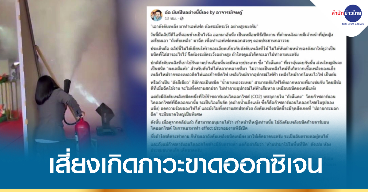 ถ้าใครคิดจะทำตาม ก็ห้ามเอาถังดับเพลิงชนิดเคมีผงมาใช้เด็ดขาดนะครับ จะเป็นอันตรายต่อผู้คนได้ และถึงแม้ก๊าซคาร์บอนไดออกไซด์จะมีอันตรายต่ำ แต่ก็อย่าลืมว่า “ห้ามนำมาใช้ในพื้นที่ปิด” ดังเช่น ห้องประชุมขนาดเล็ก เด็ดขาดครับ ควรใช้ในพื้นที่โล่ง อากาศถ่ายเทได้ หรือกลางแจ้งเท่านั้น เพื่อให้เกิดการกระจายตัวออกของก๊าซคาร์บอนไดออกไซด์ ซึ่งก๊าซนี้ถ้าสูดลมหายใจเข้าไปมากเกินไป จะเกิดอาการขาดออกซิเจนได้ เป็นอันตรายร้ายแรง อาจถึงแก่ชีวิตได้ด้วย จริงๆ ที่ควรทำมากกว่าก็คือ ควรจ้างมืออาชีพด้านการทำเอฟเฟกต์ที่มีประสบการณ์ มีความชำนาญ และรู้กฎความปลอดภัยในเรื่องนี้ มาเป็นผู้ดำเนินงานดีกว่านะครับ. – สำนักข่าวไทย