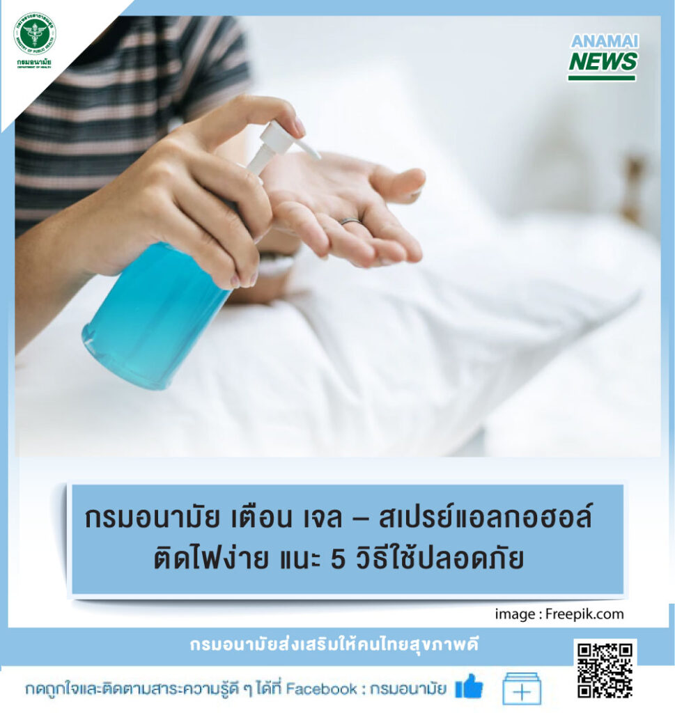 นายแพทย์สุวรรณชัย วัฒนายิ่งเจริญชัย อธิบดีกรมอนามัย กล่าวว่า จากกรณีแฟนเพจ “Survive – สายไหมต้องรอด” เปิดเผยเรื่องหญิงสาวรายหนึ่ง ที่ถูกไฟไหม้ตามร่างกาย หลังฉีดพ่นแอลกอฮอล์ใส่ตัว และเดินไปจุดยากันยุงนั้น โดยทั่วไปแอลกอฮอล์สำหรับฆ่าเชื้อ เป็นเอทิลแอลกอฮอล์ ความเข้มข้น 70 – 90 เปอร์เซนต์ มีประสิทธิภาพในการฆ่าเชื้อโรคมากที่สุด แต่ไม่ควรทาหรือราดทั้งตัว เพื่อป้องกันโรคโควิด-19 เพราะเป็นวิธีการที่ไม่ถูกต้อง ไม่สามารถป้องกันโรคได้จริง อีกทั้งอาจเกิดอันตรายได้หากกระเด็นเข้าสู่ดวงตาหรือเนื้อเยื่อ เนื่องจากแอลกอฮอล์เป็นสารติดไฟง่าย หากใช้แอลกอฮอล์ทาทั้งตัว และเข้าไกล้ไฟ จะทำให้เกิดไฟไหม้และเป็นอันตรายได้ จึงควรใช้อย่างปลอดภัย 5 วิธี ดังนี้ 1) ไม่ควรใช้สเปรย์แอลกอฮอล์บริเวณที่มีเชื้อเพลิงหรือเปลวไฟ เช่น กองไฟ เตาแก๊ส การจุดยากันยุง การจุดธูป เป็นต้น เนื่องจากแอลกอฮอล์สามารถติดไฟได้ 2) ไม่ควรแบ่งแอลกอฮอล์สำหรับการฆ่าเชื้อ ใส่ในขวดน้ำ เพราะอาจมีผู้เข้าใจผิดว่าเป็นน้ำดื่มได้ 3) ไม่ควรเก็บแอลกอฮอล์ไว้ในรถที่จอดตากแดด เพราะในรถอุณหภูมิสูงจะทำให้แอลกอฮอล์ระเหย และประสิทธิภาพลดลงจนไม่สามารถฆ่าเชื้อโรคได้ 4) ไม่ฉีดสเปรย์แอลกอฮอล์ในที่แคบ จะทำให้เกิดการฟุ้งโดนใบหน้า เข้าตา และเมื่อหายใจเข้าไปจะทำให้เกิดการระคายเคือง และ 5) ไม่ควรใช้เจลหรือสเปรย์แอลกอฮอล์บริเวณผิวบอบบาง เช่น ใบหน้า รอบดวงตา บริเวณที่ผิวอักเสบหรือมีบาดแผล เพราะจะทำให้เกิดการระคายเคือง และแสบร้อนบริเวณดังกล่าว