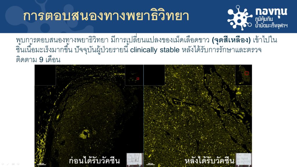 นพ.ไตรรักษ์ ระบุว่า จากการทดสอบวัคซีนกับอาสาสมัครผู้ป่วยมะเร็ง จํานวน 4 ราย แบ่งเป็น ผู้ป่วยมะเร็งผิวหนังชนิดเมลาโนมา หรือมะเร็งเม็ดสี 3 ราย และมะเร็งไต 1 ราย พบว่า การฉีดวัคซีนมีความปลอดภัย พบผลข้างเคียงน้อย เช่น มีอาการปวดตรงจุดที่ฉีดวัคซีน ไม่พบผลข้างเคียง รุนแรง และหลังจากการฉีดวัคซีน 3 สัปดาห์ พบว่าการตอบสนองทางภูมิคุ้มกันในผู้ป่วยทั้ง 4 ราย ดีขึ้นอย่างชัดเจน และเป็นการตอบสนองทางภูมิคุ้มกันที่มีความจําเพาะต่อชิ้นส่วนการกลายพันธุ์ของผู้ป่วยมะเร็งรายนั้น นอกจากนี้ ทีมวิจัยได้ตรวจติดตามการตอบสนองทางพยาธิวิทยาในผู้ป่วย 1 ราย โดยประเมินการกระจายตัวของเม็ดเลือดขาวชนิดทีเซลล์ในชิ้นเนื้อมะเร็ง พบว่า ก่อนฉีดวัคซีน ตรวจพบเซลล์เม็ดเลือดขาวอยู่บริเวณรอบนอกก้อนมะเร็งเป็นหลัก แต่หลังได้รับวัคซีน พบว่าเม็ดเลือดขาวมีการกระจายตัวเข้าไปในชิ้นเนื้อมะเร็งมากขึ้น โดยผู้ป่วยรายนี้ยังมีอาการคงที่หลังได้รับวัคซีน