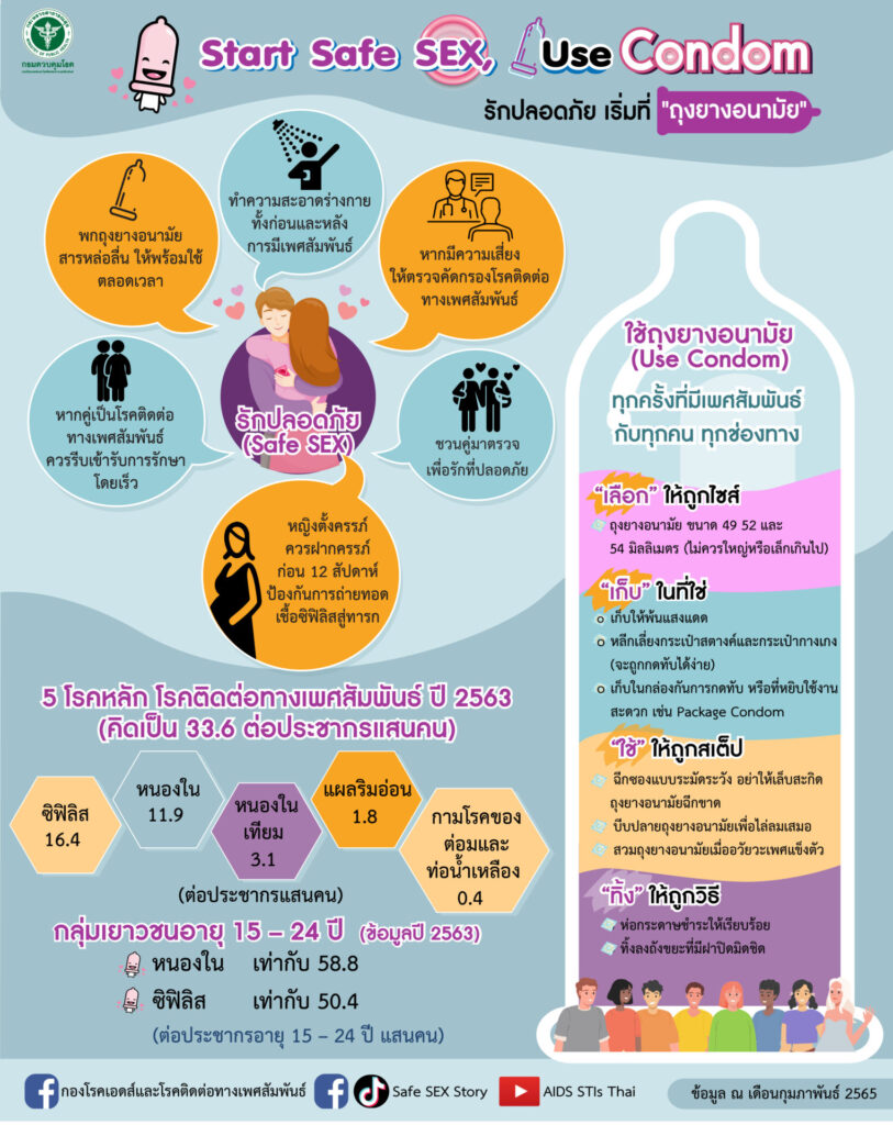 กรมควบคุมโรค จึงแนะนำหลัก Start Safe SEX, Use Condom : รักปลอดภัยเริ่มที่ “ถุงยางอนามัย” เพื่อเป็นแนวทางให้กับเยาวชนได้เห็นถึงความสำคัญในการป้องกันตนเองและคู่ให้ปลอดภัยจากโรคติดต่อทางเพศสัมพันธ์และเอชไอวี ตลอดจนส่งเสริมการใช้ถุงยางอนามัยให้เป็นเรื่องปกติในการดูแลสุขภาวะทางเพศ รวมถึงการมีความรับผิดชอบต่อคู่และสังคม โดยยึดหลัก ดังนี้ รักปลอดภัย (Safe SEX) การมีเพศสัมพันธ์ที่ปลอดภัยอย่างมีสุขภาวะทางเพศที่ดี โดยการพกอุปกรณ์ป้องกัน และหากพบว่าตนเองมีความเสี่ยงควรเข้ารับการคัดกรอง หรือหากมีฝ่ายใดฝ่ายหนึ่งเป็นโรคติดต่อทางเพศสัมพันธ์ ควรรีบเข้ารับการรักษาโดยเร็ว พร้อมชวนคู่ มาตรวจด้วย นอกจากนี้คุณแม่ที่มีเชื้อซิฟิลิส สามารถถ่ายทอดเชื้อไปสู่ทารกในครรภ์ได้ ดังนั้น ควรเข้ารับการฝากครรภ์โดยเร็วก่อนอายุครรภ์ 12 สัปดาห์ เพื่อคัดกรอง และรักษา เพื่อลดการถ่ายทอดเชื้อไปสู่ทารกในครรภ์ได้ จึงอยากให้ทุกคนเริ่มที่การมีเพศสัมพันธ์ที่ปลอดภัย ด้วยการ ใช้ถุงยางอนามัย (Use Condom) อย่างถูกวิธีทุกครั้งที่มีเพศสัมพันธ์ โดยเลือกให้ถูกไซส์ ใช้ให้ถูกสเต็ป เก็บและทิ้งให้ถูกวิธี ซึ่งถุงยางอนามัยเป็นอุปกรณ์ชนิดเดียวที่สามารถป้องกันได้ทั้งเชื้อเอชไอวี โรคติดต่อทางเพศสัมพันธ์ และการตั้งครรภ์ที่ไม่พร้อม การใช้ถุงยางอนามัยไม่ได้หมายความว่าไม่เชื่อใจต่อกัน แต่เป็นการแสดงความรับผิดชอบต่อตนเองและคู่ เพียงเริ่มต้นด้วยการหยิบถุงยางอนามัยมาใช้ทุกครั้งที่มีเพศสัมพันธ์ก็จะทำให้คุณมีรักที่ปลอดภัย ไร้โรคติดต่อทางเพศสัมพันธ์ได้