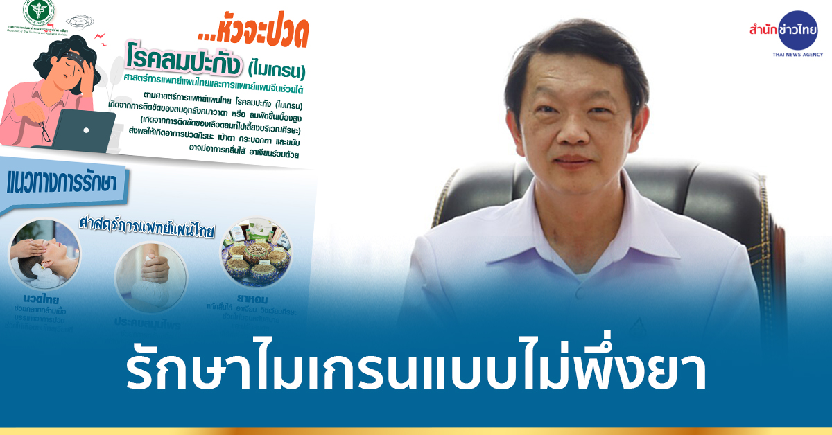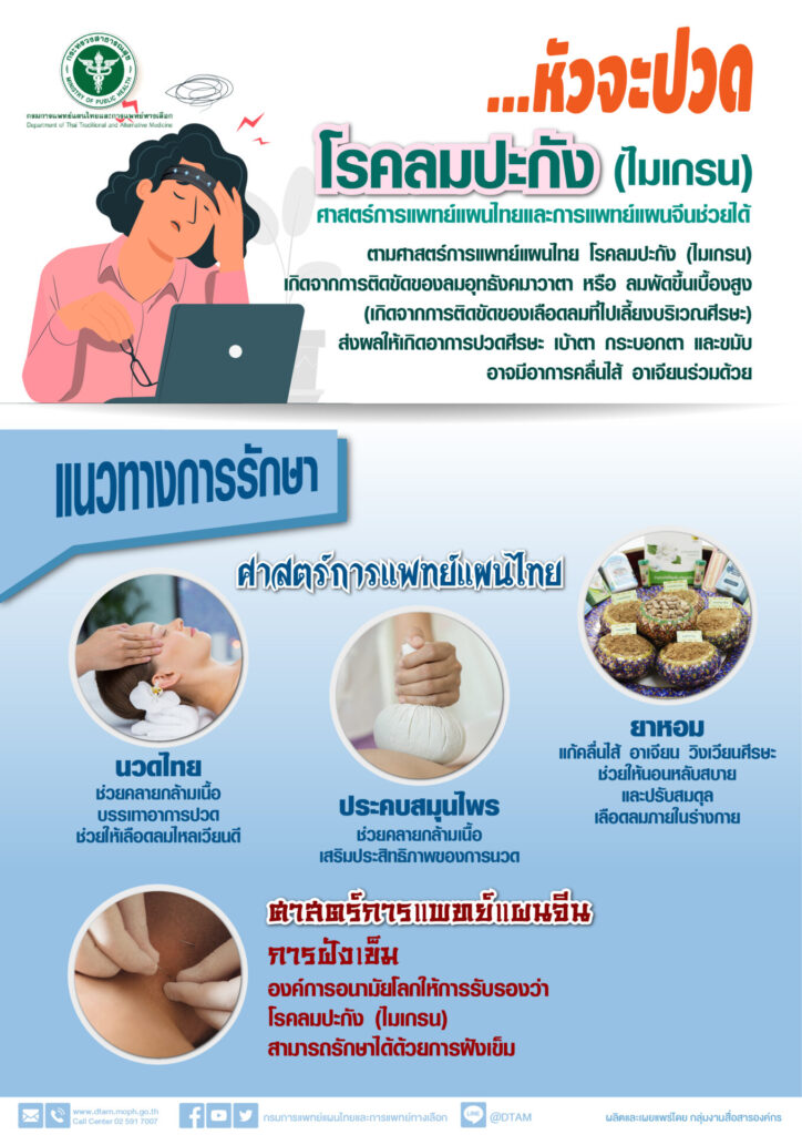 นายแพทย์ขวัญชัย วิศิษฐานนท์ รองอธิบดีกรมการแพทย์แผนไทยและการแพทย์ทางเลือก กล่าวว่า โรคปวดศีรษะไมเกรน หรือ โรคลมปะกัง เป็นกลุ่มอาการปวดศีรษะเรื้อรังที่พบได้ทั่วไปในคนทุกวัย พบมากในผู้หญิงมากว่าผู้ชายประมาณ 3.5 เท่า เป็นโรคที่ไม่มีอันตรายร้ายแรง แต่สร้างความรําคาญและ ส่งผลกระทบต่อการใช้ชีวิตประจําวัน สําหรับอาการของของโรค ส่วนใหญ่มักจะมีอาการปวดศีรษะตุบ ๆ เข้ากับจังหวะการเต้นของหัวใจ บริเวณขมับ ข้างใดข้างหนึ่ง หรืออาจปวดพร้อมกันทั้งสองข้างก็ได้ บางรายอาจมีอาการปวดรอบกระบอกตา ตาพร่ามัวร่วมด้วย อาการปวดจะกินเวลาประมาณ 4-72 ชั่วโมง สาเหตุการเกิดโรคนี้ ไม่ทราบแน่ชัด แต่ผู้ป่วยมักจะให้ประวัติว่ามีสิ่งที่มากระตุ้นให้เกิดอาการ เช่น การมีแสงจ้าเข้าตา การใช้สายตาเพ่งดูอะไรนาน ๆ การอยู่ในที่ ที่มีเสียงดัง กลิ่นฉุน การรับประทานอาหารบางประเภท เช่น ช็อกโกแลต เหล้า เบียร์ ฯ การพักผ่อน ไม่เพียงพอ หรืออิทธิพลของฮอร์โมน และอื่น ๆ
