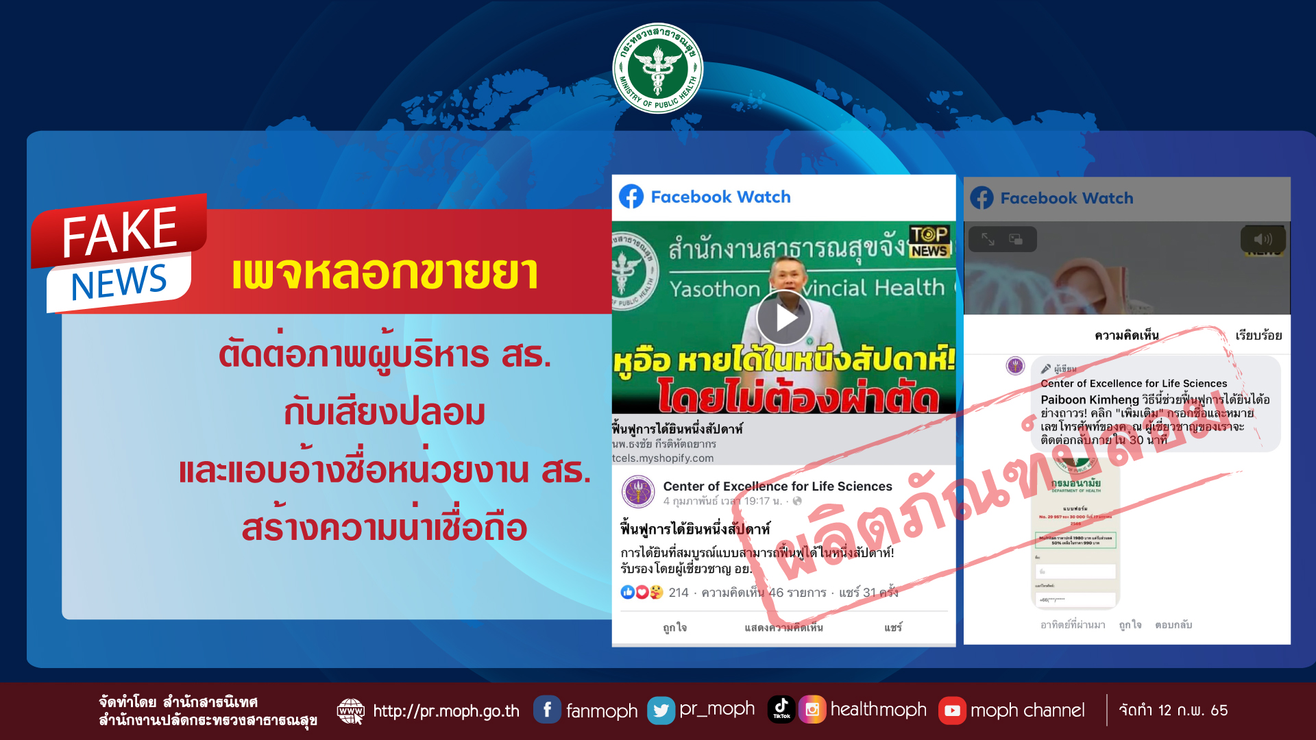 นายแพทย์รุ่งเรือง กิจผาติ ที่ปรึกษาระดับกระทรวง และโฆษกกระทรวงสาธารณสุข กล่าวถึงกรณี มีเพจเฟซบุ๊กขายผลิตภัณฑ์สุขภาพ นำคลิปข่าวของ นายแพทย์ธงชัย กีรติหัตถยากร รองปลัดกระทรวงสาธารณสุข จากสื่อโทรทัศน์ช่องหนึ่ง ตัดต่อเสียงพูดโฆษณาขายสินค้า รวมถึงอ้างชื่อหน่วยงาน อย. และกรมอนามัย เพื่อสร้างความน่าเชื่อถือ สร้างความเสียหายต่อกระทรวงสาธารณสุขและผู้บริหารที่ถูกกล่าวอ้าง เบื้องต้น ได้ประสานไปยังสื่อช่องที่ปรากฏในคลิปแล้ว พบว่าโฆษณาดังกล่าวไม่ได้เป็นการเผยแพร่ของสถานี จึงได้มอบให้กองกฎหมาย ประสานงานกับกระทรวงดิจิทัลเพื่อเศรษฐกิจและสังคม ซึ่งดูแลศูนย์ต่อต้านข่าวปลอม ดำเนินการทางกฎหมายต่อไป โดยการกระทำดังกล่าวมีความผิดตามพระราชบัญญัติว่าด้วยการกระทำความผิดเกี่ยวกับคอมพิวเตอร์ พ.ศ. 2550 และที่แก้ไขเพิ่มเติม พ.ศ. 2560 “มาตรา 16 ผู้ใดนําเข้าสู่ระบบคอมพิวเตอร์ที่ประชาชนทั่วไปอาจเข้าถึงได้ซึ่งข้อมูลคอมพิวเตอร์ที่ปรากฏเป็นภาพของผู้อื่น และภาพนั้นเป็นภาพที่เกิดจากการสร้างขึ้น ตัดต่อ เติม หรือดัดแปลง ด้วยวิธีการทางอิเล็กทรอนิกส์หรือวิธีการอื่นใด โดยประการที่น่าจะทำให้ผู้อื่นนั้นเสียชื่อเสียง ถูกดูหมิ่น ถูกเกลียดชัง หรือได้รับความอับอาย ต้องระวางโทษจําคุกไม่เกินสามปี และปรับไม่เกินสองแสนบาท”