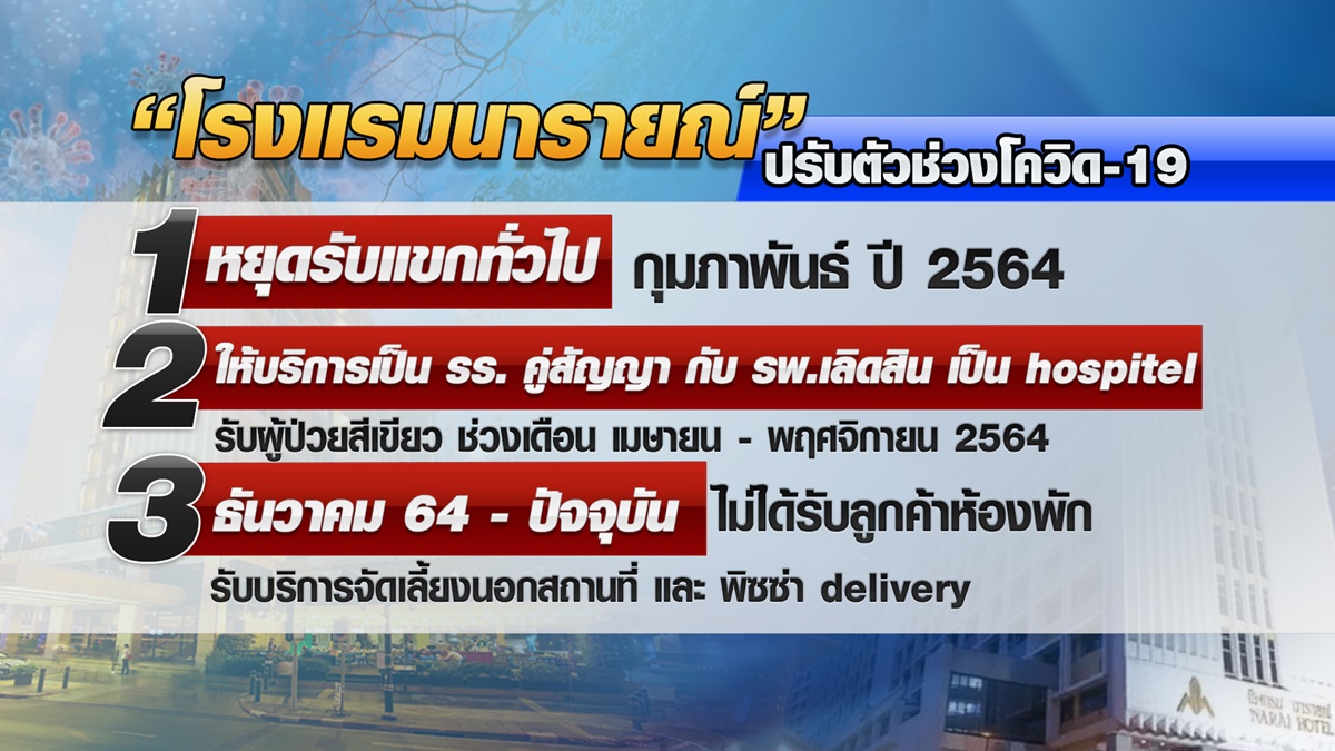 สำหรับโรงแรมนารายณ์ได้หยุดรับแขกทั่วไป ตั้งแต่เดือนกุมภาพันธ์ 2564 ปรับมาให้บริการเป็นโรงแรมคู่สัญญากับโรงพยาบาลเลิดสิน เป็นฮอสพิเทลรับผู้ป่วยสีเขียว ช่วงเดือนเมษายน-พฤศจิกายน 2564 กระทั่งเดือนธันวาคม 2564 ถึงปัจจุบัน ไม่ได้รับลูกค้าห้องพัก รับบริการจัดเลี้ยงนอกสถานที่ และพิซซ่า เดลิเวอรี เท่านั้น
