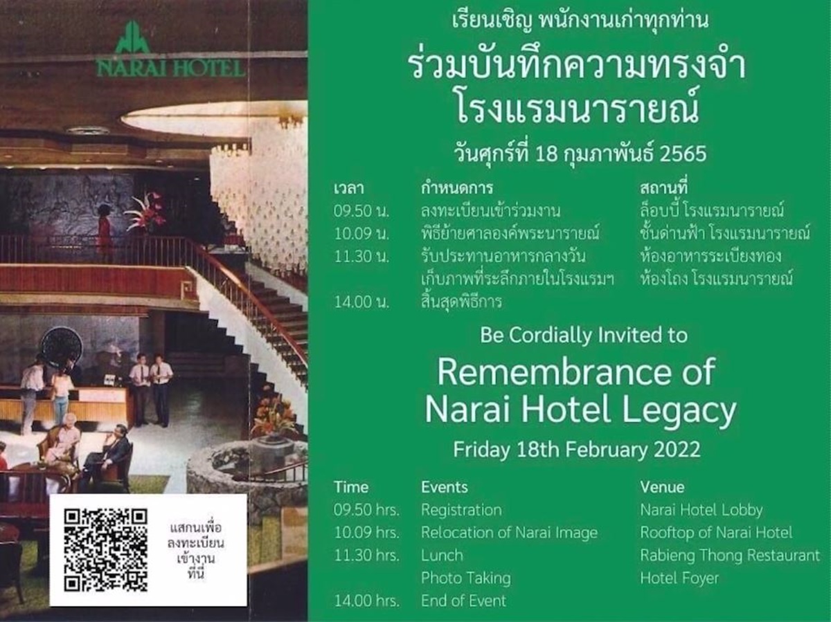 บรรยากาศโรงแรมนารายณ์ โรงแรมเก่าแก่ เปิดดำเนินกิจการมาแล้ว 54 ปี ที่ย่านถนนสีลม วันนี้ (15 ก.พ.) เป็นไปด้วยความเงียบเหงา มีพนักงานบางส่วนที่ยังมาทำงาน เนื่องจากโรงแรมได้หยุดดำเนินกิจการมาระยะหนึ่งแล้วตั้งแต่โควิดระบาด พนักงานที่มาวันนี้ เพื่อจัดเตรียมงาน ซึ่งใช้ชื่อว่า “ร่วมบันทึก ความทรงจำโรงแรมนารายณ์” ในวันศุกร์ที่ 18 กุมภาพันธ์นี้ โดยพนักงานทุกคนมาร่วมงาน เพื่อถ่ายภาพเป็นที่ระลึก รวมทั้งร่วมพิธีย้ายศาลพระนารายณ์ ซึ่งอยู่ชั้นดาดฟ้าของโรงแรม โดยวันนี้พนักงานมาจัดเตรียมสิ่งของและเครื่องเซ่นไหว้ เช่น ธูปจัดมัดรวมกันเป็นชุด ชุดละ 9 ดอก สำหรับพิธีสำคัญดังกล่าว โดยองค์พระนารายณ์ที่อยู่คู่โรงแรมมาตั้งแต่เริ่มต้น จะนำมาให้ประชาชนทั่วไปได้สักการะ เพื่อสร้างเป็นแลนด์มาร์กใหม่ในย่านสีลม