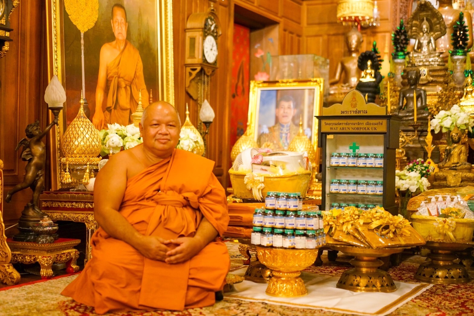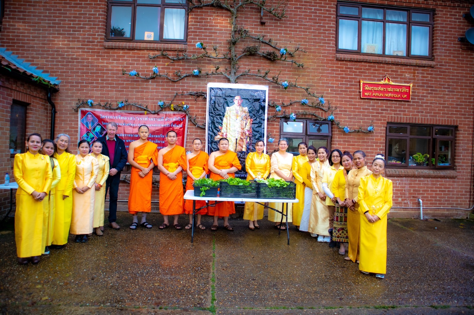 พระราชมหาเจติยาภิบาล ผู้ช่วยเจ้าอาวาสวัดอรุณราชวราราม ประธานสมาคมวัดอรุณสหราชอาณาจักร เมืองนอริช เปิดเผยว่า พระบาทสมเด็จพระเจ้าอยู่หัว ทรงมีพระราชศรัทธาทรงพระกรุณาโปรดเกล้าฯ ให้ พลอากาศตรีสุพิชัย สุนทรบุระ รองเลขาธิการพระราชวัง เป็นผู้เเทนพระองค์ เชิญ ผ้าไตร ย่าม เครื่องสังฆทาน ตู้ยาพระราชทาน ร่มอุ่นไอรัก เพื่อนำถวายแด่คณะพระธรรมทูตผู้ปฎิบัติศาสนกิจ ณ วัดอรุณสหราชอาณาจักร เมืองนอริช