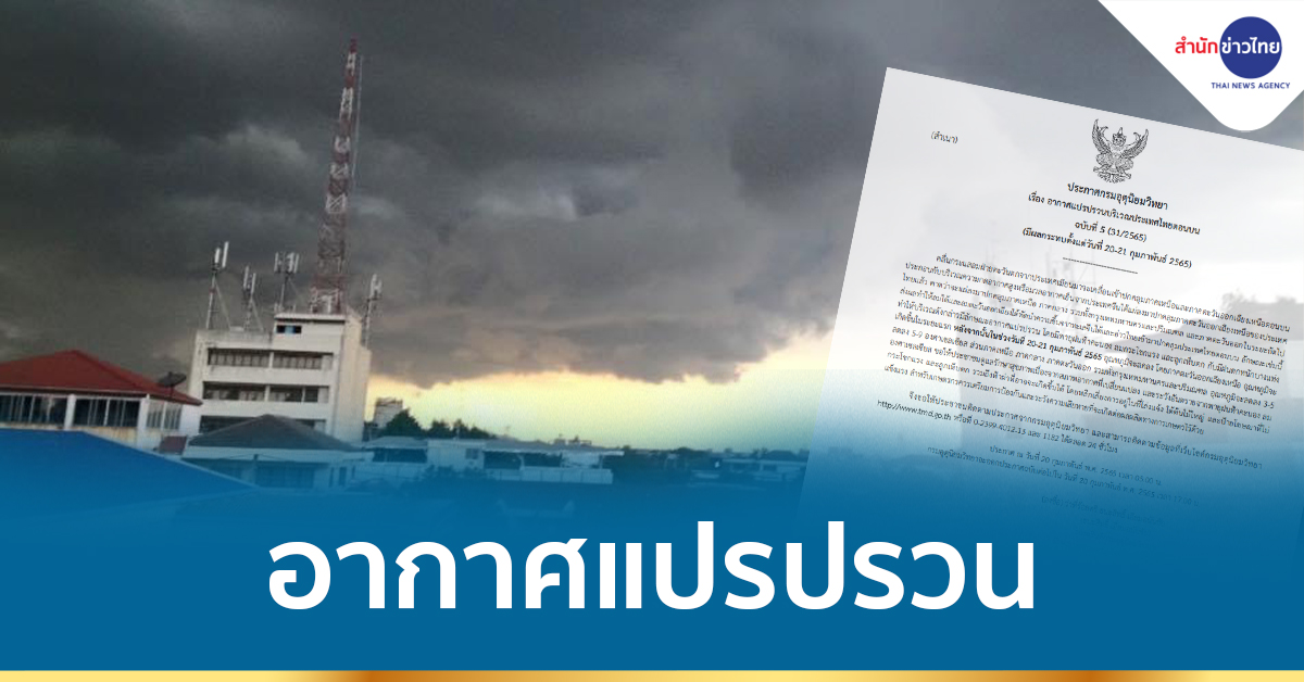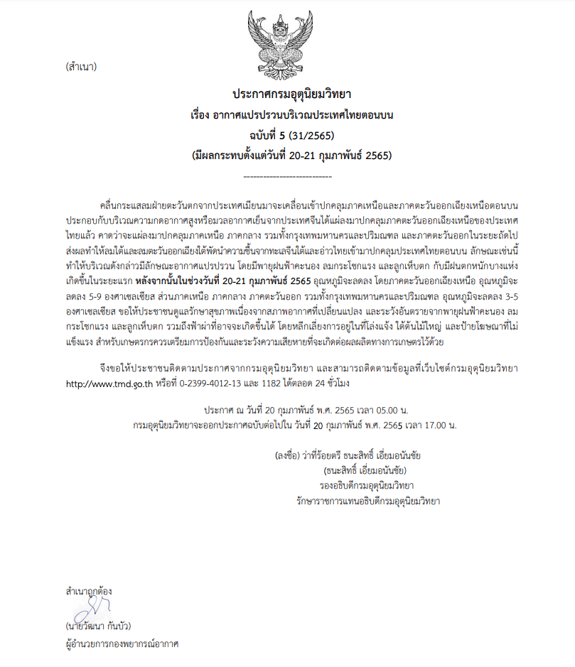 กรมอุตุนิยมวิทยา ออกประกาศฉบับที่ 5 อากาศแปรปรวนบริเวณประเทศไทยตอนบน มีผลกระทบตั้งแต่วันที่ 20-21 กุมภาพันธ์ 2565 คลื่นกระแสลมฝ่ายตะวันตกจากประเทศเมียนมาจะเคลื่อนเข้าปกคลุมภาคเหนือและภาคตะวันออกเฉียงเหนือตอนบน ประกอบกับบริเวณความกดอากาศสูงหรือมวลอากาศเย็นจากประเทศจีนได้แผ่ลงมาปกคลุมภาคตะวันออกเฉียงเหนือของประเทศไทยแล้ว คาดว่าจะแผ่ลงมาปกคลุมภาคเหนือ ภาคกลาง รวมทั้งกรุงเทพมหานครและปริมณฑล และภาคตะวันออกในระยะถัดไป ส่งผลทำให้ลมใต้และลมตะวันออกเฉียงใต้พัดนำความชื้นจากทะเลจีนใต้และอ่าวไทยเข้ามาปกคลุมประเทศไทยตอนบน ลักษณะเช่นนี้ทำให้บริเวณดังกล่าวมีลักษณะอากาศแปรปรวน โดยมีพายุฝนฟ้าคะนอง ลมกระโชกแรง และลูกเห็บตก กับมีฝนตกหนักบางแห่งเกิดขึ้นในระยะแรก หลังจากนั้นในช่วงวันที่ 20-21 กุมภาพันธ์ 2565 อุณหภูมิจะลดลง โดยภาคตะวันออกเฉียงเหนือ อุณหภูมิจะลดลง 5-9 องศาเซลเซียส ส่วนภาคเหนือ ภาคกลาง ภาคตะวันออก รวมทั้งกรุงเทพมหานครและปริมณฑล อุณหภูมิจะลดลง 3-5 องศาเซลเซียส ขอให้ประชาชนดูแลรักษาสุขภาพเนื่องจากสภาพอากาศที่เปลี่ยนแปลง และระวังอันตรายจากพายุฝนฟ้าคะนอง ลมกระโชกแรง และลูกเห็บตก รวมถึงฟ้าผ่าที่อาจจะเกิดขึ้นได้ โดยหลีกเลี่ยงการอยู่ในที่โล่งแจ้ง ใต้ต้นไม้ใหญ่ และป้ายโฆษณาที่ไม่แข็งแรง สำหรับเกษตรกรควรเตรียมการป้องกันและระวังความเสียหายที่จะเกิดต่อผลผลิตทางการเกษตรไว้ด้วย