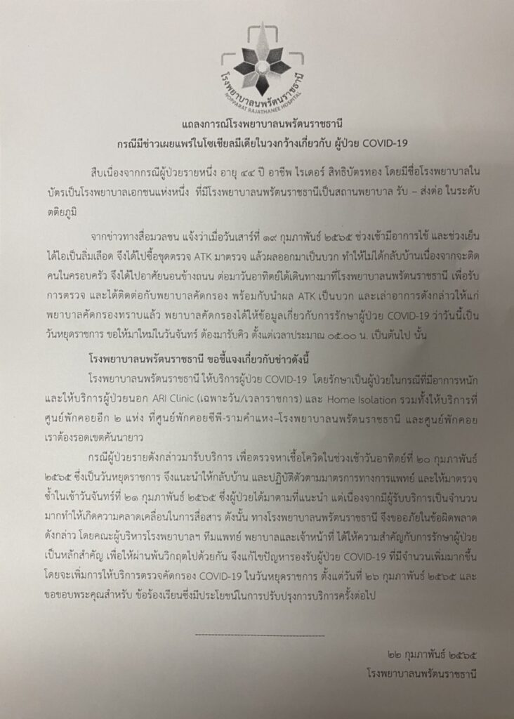 ล่าสุด รพ.นพรัตนราชธานี ออกแถลงการณ์ระบุ จากการตรวจสอบพบว่าผู้ป่วยรายดังกล่าว มีสิทธิบัตรทอง โดยมีชื่อ รพ.ในบัตรเป็นโรงพยาบาลเอกชนแห่งหนึ่ง ที่มี รพ.นพรัตนราชธานีเป็นสถานพยาบาลรับ-ส่งต่อในระดับตติยภูมิ ทั้งนี้ ชี้แจงว่า รพ.นพรัตนราชธานี เปิดให้บริการผู้ป่วยโควิด โดยรักษาผู้ป่วยในกรณีที่มีอาการหนัก และให้บริการผู้ป่วยนอก ARI คัดกรองผู้ป่วยโรคทางเดินหายใจ เฉพาะในวันจันทร์-ศุกร์ กรณีผู้ป่วยรายดังกล่าวมารับบริการ เพื่อตรวจหาเชื้อเช้าวันอาทิตย์ที่ 20 ก.พ. 2565 ซึ่งเป็นวันหยุดราชการ จึงแนะนำให้กลับบ้านก่อนและปฏิบัติตามมาตรการทางการแพทย์ และให้มาตรวจซ้ำวันจันทร์ที่ 21 ก.พ. ซึ่งผู้ป่วยมาตามคำแนะนำ แต่เนื่องจากมีผู้รอรับบริการจำนวนมาก ทำให้เกิดความเข้าใจคลาดเคลื่อนในการสื่อสาร รพ.ต้องขออภัยในความผิดพลาด ยืนยันว่า รพ.ให้ความสำคัญและขอบคุณการร้องเรียน เพื่อให้มีการแก้ไขปรับปรุง และเพื่อรองรับผู้ป่วยที่มีแนวโน้มเพิ่มขึ้น จึงจะเพิ่มให้บริการตรวจคัดกรองโควิดในวันหยุดราชการตั้งแต่วันที่ 26 ก.พ.นี้ เป็นต้นไป