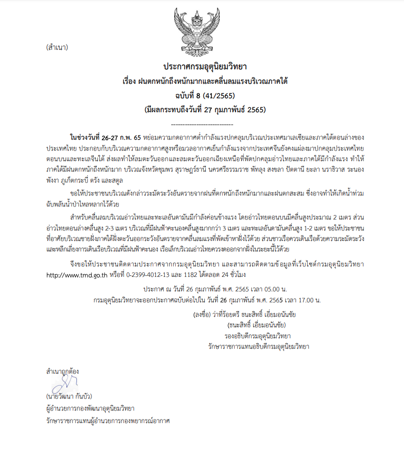 กรมอุตุนิยมวิทยา ออกประกาศ ฉบับที่ 8 ฝนตกหนักถึงหนักมากและคลื่นลมแรงบริเวณภาคใต้ มีผลกระทบถึงวันที่ 27 กุมภาพันธ์ 2565 โดยช่วงวันที่ 26-27 ก.พ. 65 หย่อมความกดอากาศต่ำกำลังแรงปกคลุมบริเวณประเทศมาเลเซียและภาคใต้ตอนล่างของประเทศไทย ประกอบกับบริเวณความกดอากาศสูงหรือมวลอากาศเย็นกำลังแรงจากประเทศจีนยังคงแผ่ลงมาปกคลุมประเทศไทยตอนบนและทะเลจีนใต้ ส่งผลทำให้ลมตะวันออกและลมตะวันออกเฉียงเหนือที่พัดปกคลุมอ่าวไทยและภาคใต้มีกำลังแรง ทำให้ภาคใต้มีฝนตกหนักถึงหนักมาก บริเวณจังหวัดชุมพร สุราษฎร์ธานี นครศรีธรรมราช พัทลุง สงขลา ปัตตานี ยะลา นราธิวาส ระนอง พังงา ภูเก็ต กระบี่ ตรัง และสตูล ขอให้ประชาชนบริเวณดังกล่าวระมัดระวังอันตรายจากฝนที่ตกหนักถึงหนักมากและฝนตกสะสม ซึ่งอาจทำให้เกิดน้ำท่วมฉับพลันน้ำป่าไหลหลากไว้ด้วย