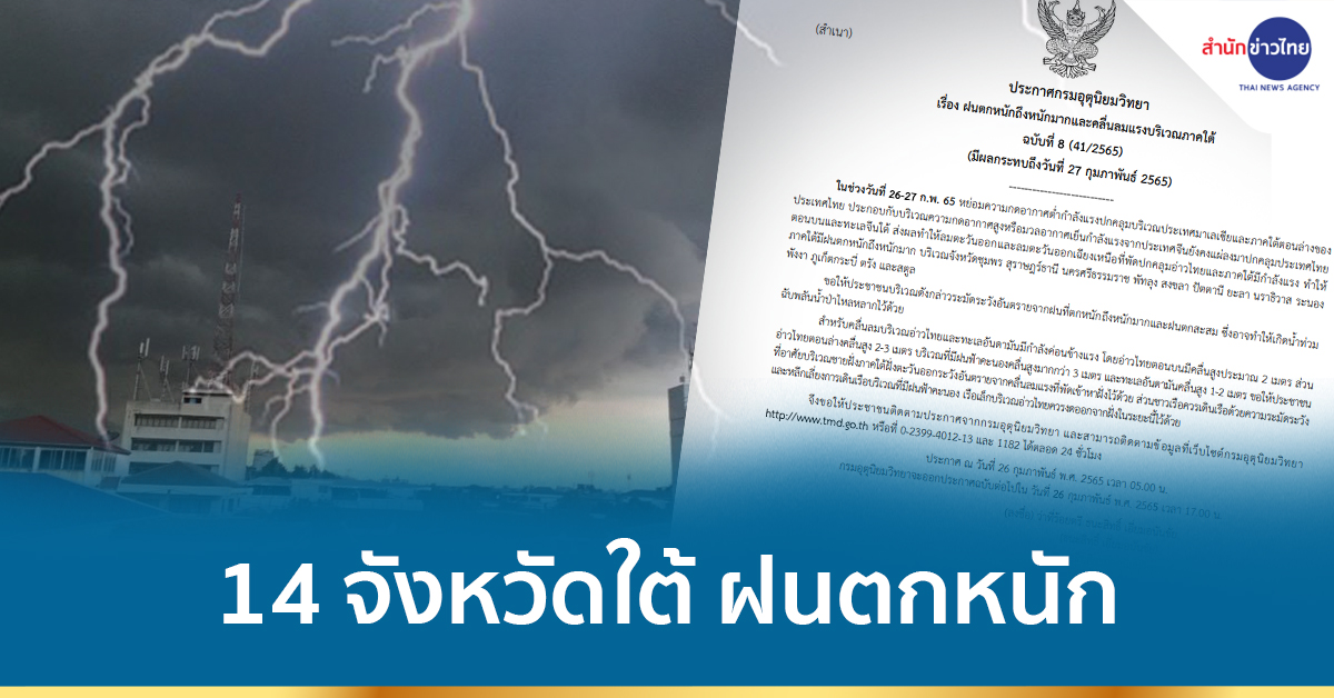 กทม. 26 ก.พ.- กรมอุตุฯ เตือน 14 จังหวัดภาคใต้ ช่วง 26-27 ก.พ. ฝนตกหนักถึงหนักมาก อาจเกิดน้ำท่วมฉับพลัน น้ำป่าไหลหลาก
