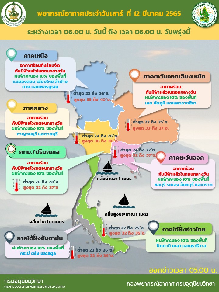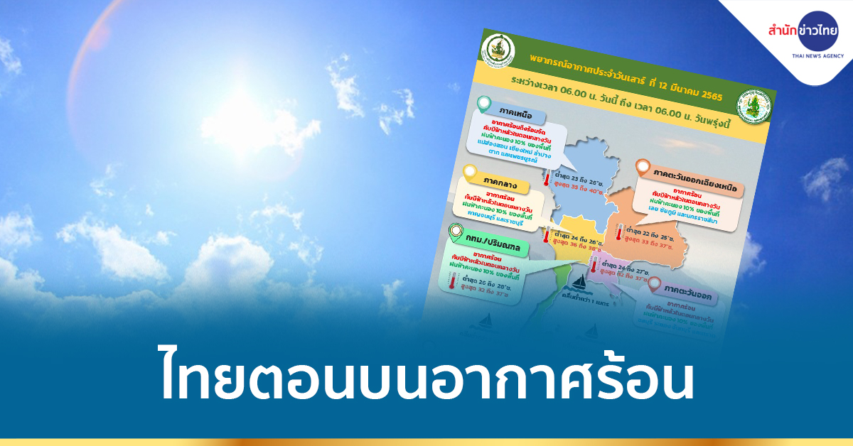กทม. 12 มี.ค.- กรมอุตุฯ เผยไทยตอนบนอากาศร้อนกับมีฟ้าหลัวตอนกลางวัน ร้อนจัดบางพื้นที่ กทม.ฝนฟ้าคะนองร้อยละ 10