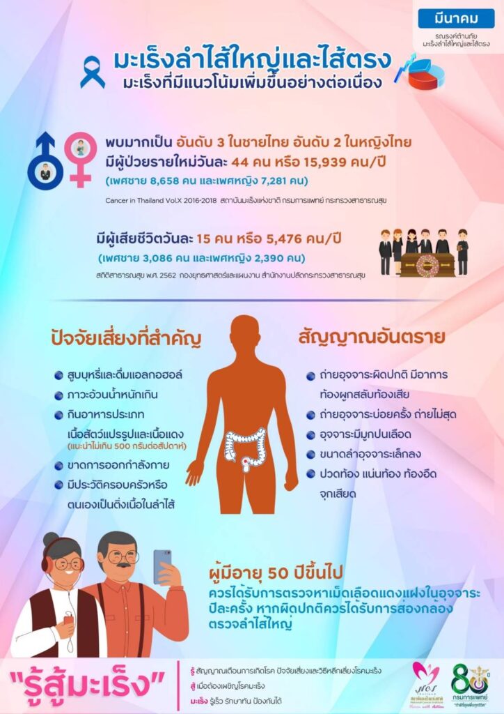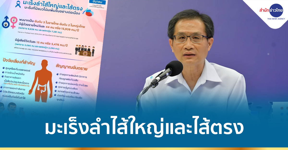 นายแพทย์สมศักดิ์ อรรฆศิลป์ อธิบดีกรมการแพทย์ กล่าวว่า ถือเป็นปัญหาสาธารณสุขที่สำคัญของประเทศ จากสถิติทะเบียนมะเร็งประเทศไทยรายงานว่ามะเร็งลำไส้ใหญ่และไส้ตรงถือเป็น 1 ใน 5 ของมะเร็งที่พบมากในคนไทย มีอัตราการเกิดโรคสูงขึ้นอย่างต่อเนื่องทุกปี ปัจจุบันมีรายงานผู้ป่วยรายใหม่ประมาณ 16,000 คนต่อปี เป็นเพศชายและหญิงราว 8,658 และ 7,281 คน ตามลำดับ และมีผู้เสียชีวิตประมาณ 5,500 คนต่อปี สาเหตุของโรคส่วนหนึ่งเป็นผลมาจากพฤติกรรมการดำเนินชีวิตที่ทำให้เพิ่มความเสี่ยงของการเกิดโรค โดยเฉพาะพฤติกรรมการบริโภค เช่น การรับประทานอาหารในกลุ่มเนื้อแดงและเนื้อแปรรูปที่ปิ้งย่างไหม้เกรียม อาหารที่มีไขมันสูง/อาหารฟาสฟูดส์ต่าง ๆ นอกจากนี้ยังมีปัจจัยเสี่ยงอื่นๆ เช่น การดื่มเครื่องดื่มแอลกอฮอล์ การสูบบุหรี่ การมีภาวะอ้วนน้ำหนักเกิน ตลอดจนการมีประวัติครอบครัวหรือตนเอง เป็นติ่งเนื้อในลำไส้ เป็นต้น